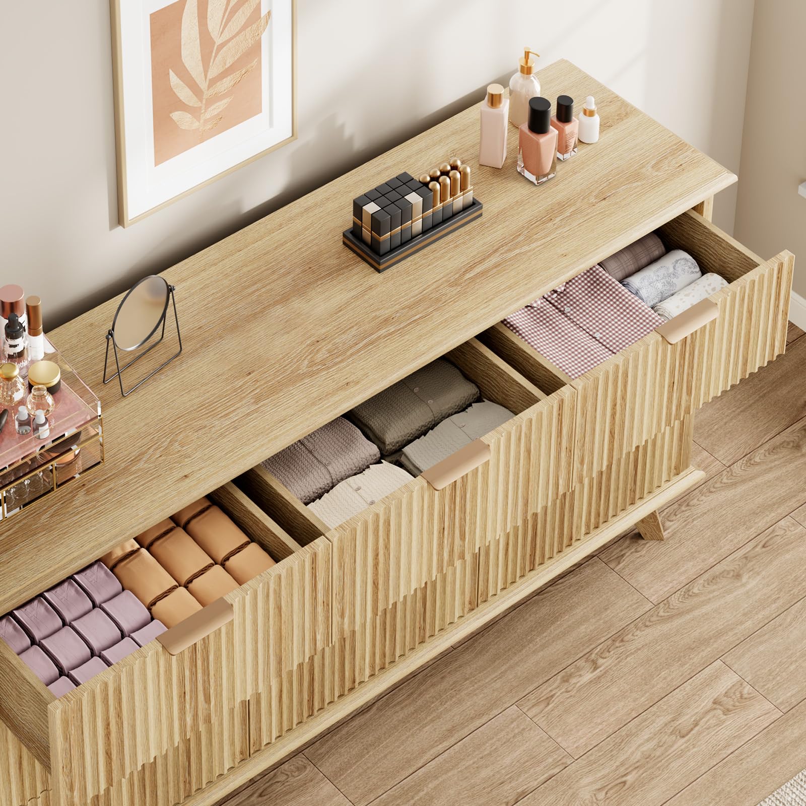 This modern 9-drawer dresser combines sophisticated fluted detailing with practical storage solutions for contemporary living spaces. The wave-patterned texture creates dimensional depth across the surface, while wide metal handles and splayed base legs deliver a refined aesthetic. Crafted from premium engineered wood in a natural oak finish, this versatile piece functions equally well as a bedroom dresser, TV stand, or hallway organizer.