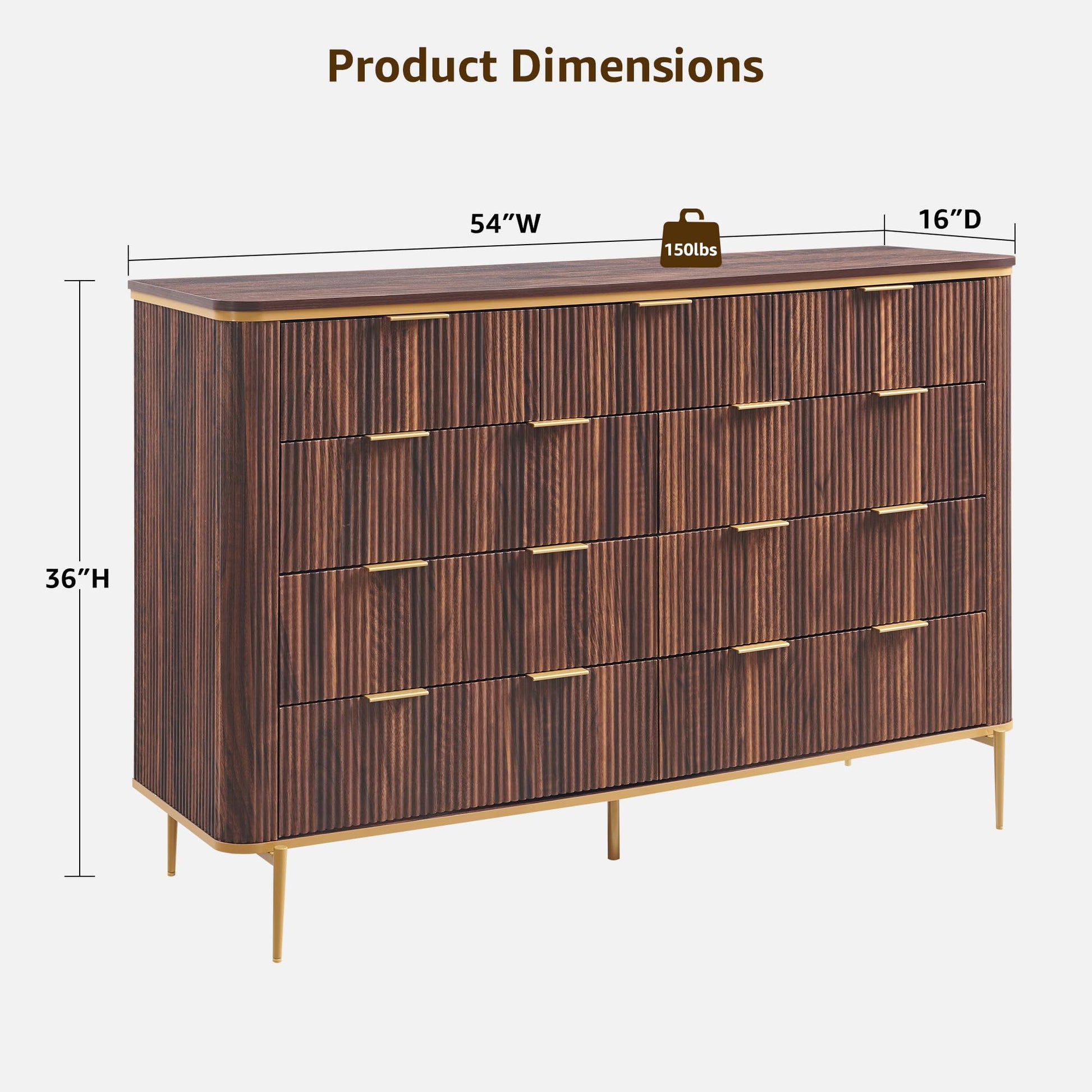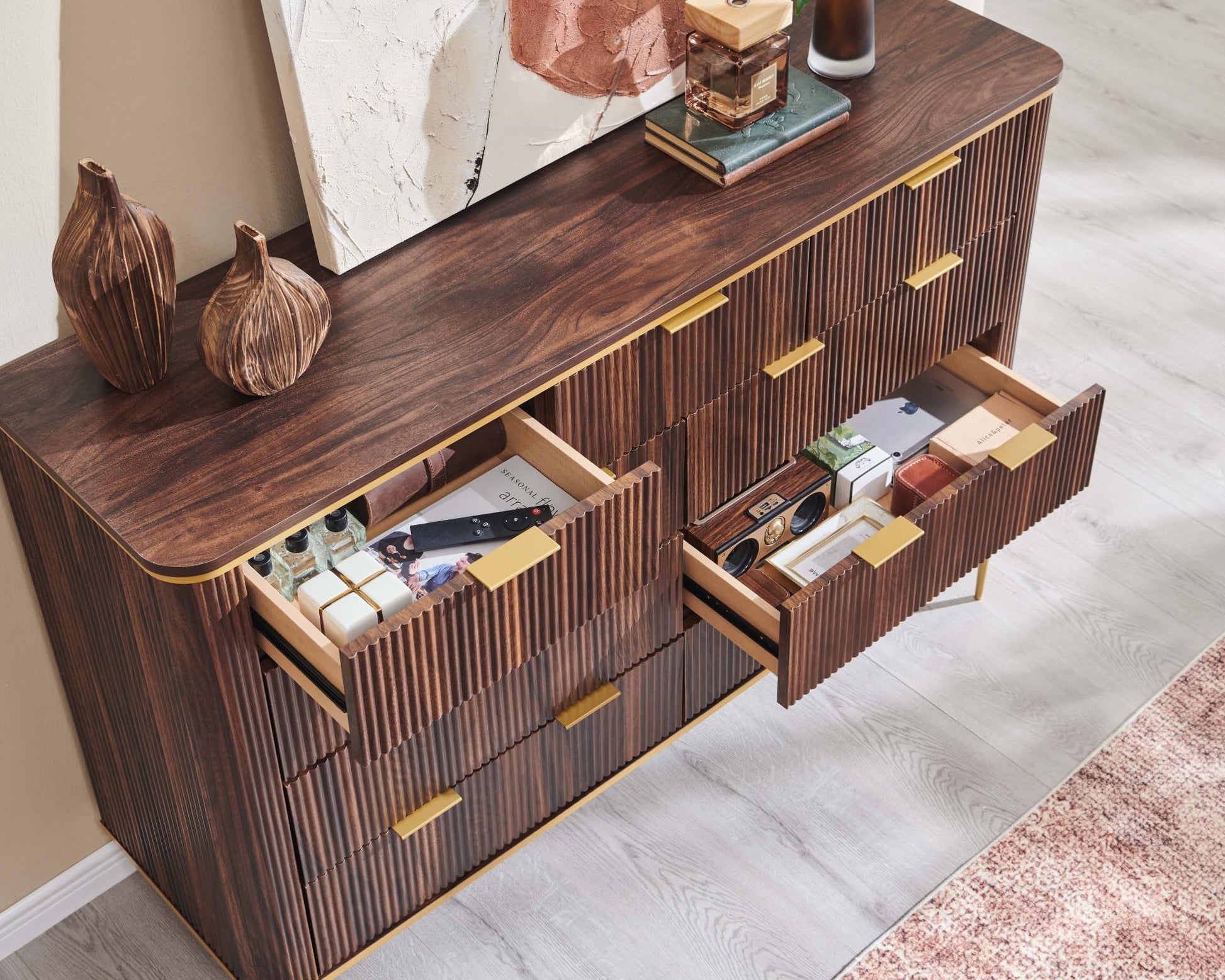 This modern wooden dresser features a sophisticated fluted design with curved profile detailing, offering both style and functionality. The 9-drawer configuration provides ample storage space for bedroom, living room, or hallway organization.