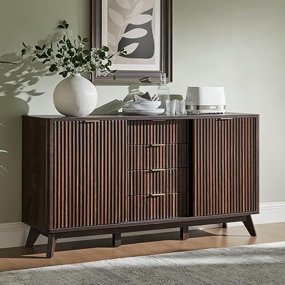 This sideboard offers endless possibilities for home organization. The generous tabletop provides ample space to showcase decorations, coffee machines, or tableware. Two sliding-door cabinets feature adjustable shelves, while four smooth-gliding drawers offer customizable storage solutions. Perfect for dining rooms, kitchens, living rooms, or as a coffee bar station.