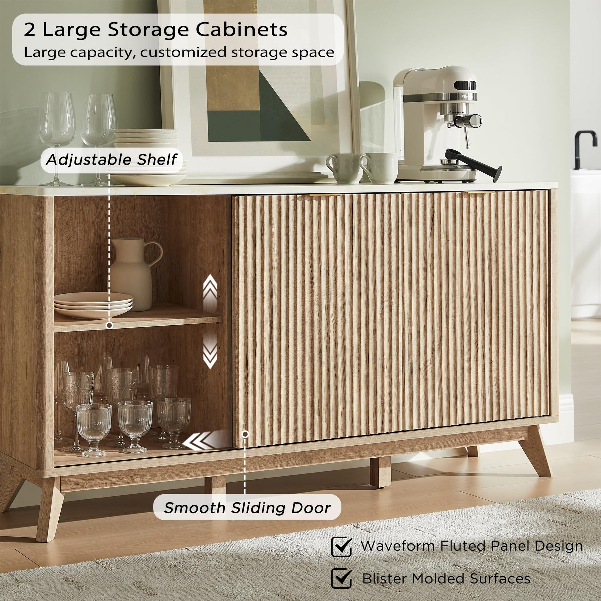 This elegant buffet cabinet combines timeless design with modern functionality. The wavy fluted panel adds refined texture and visual spaciousness, while the off-white faux marble top perfectly complements the natural oak finish. Smooth curved edges, large metal handles, and splayed legs create a stunning piece that effortlessly blends sophistication with contemporary style.