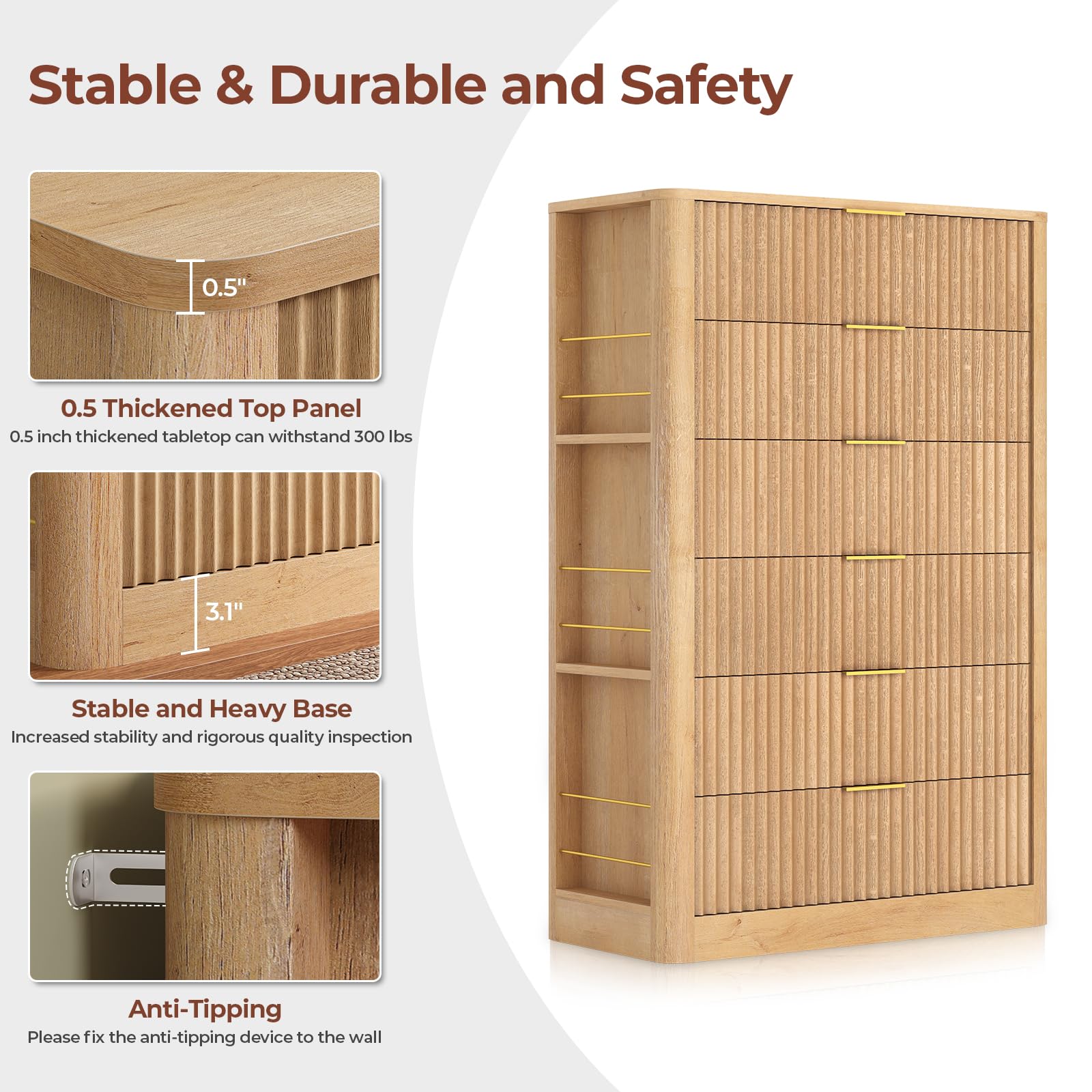 - 6 spacious drawers plus 3-tier open side shelf for maximum organization