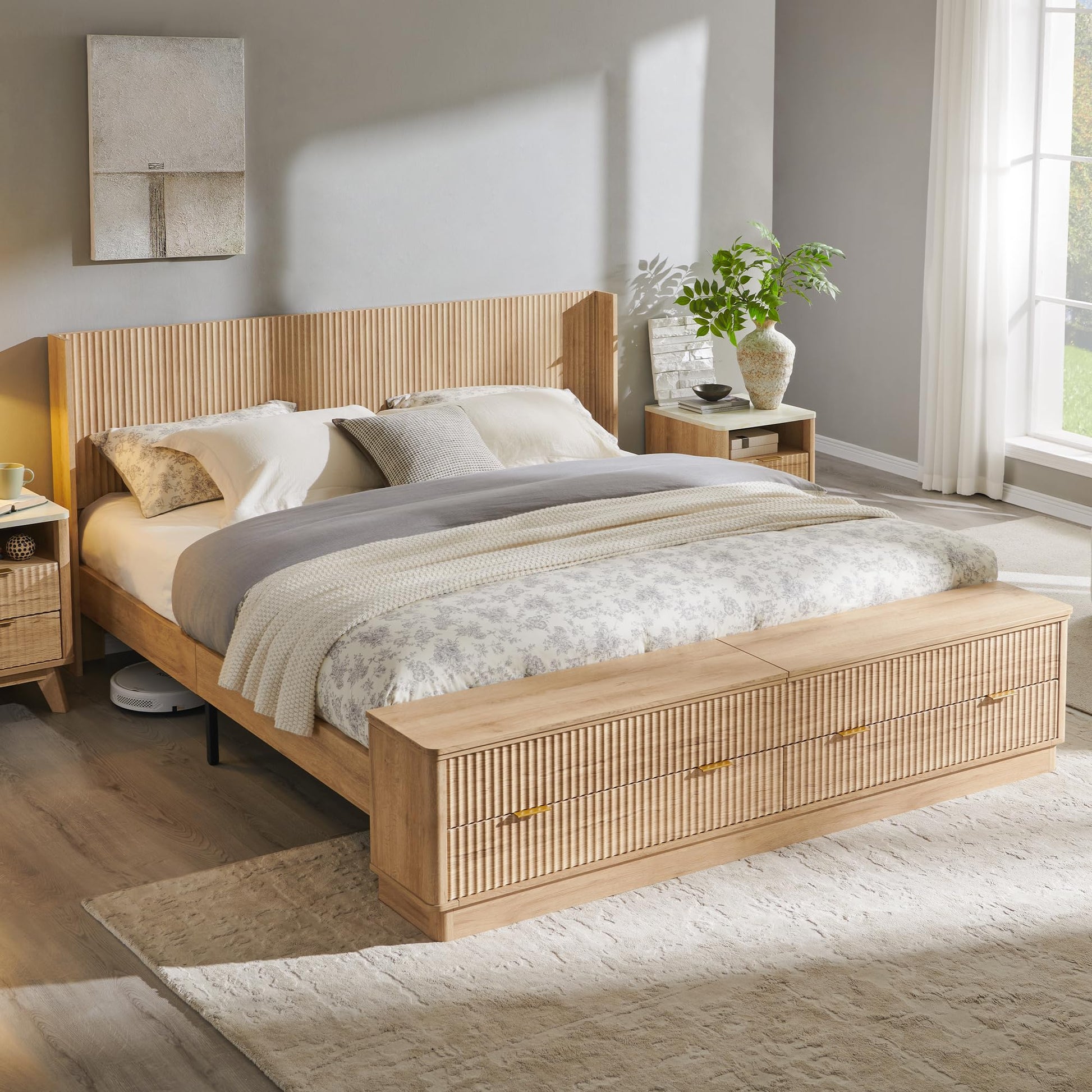 Transform your bedroom with this sophisticated platform bed featuring architectural fluted detailing and comprehensive storage solutions. The wingback headboard design provides elegant comfort while the integrated footboard storage bench maximizes functionality.
