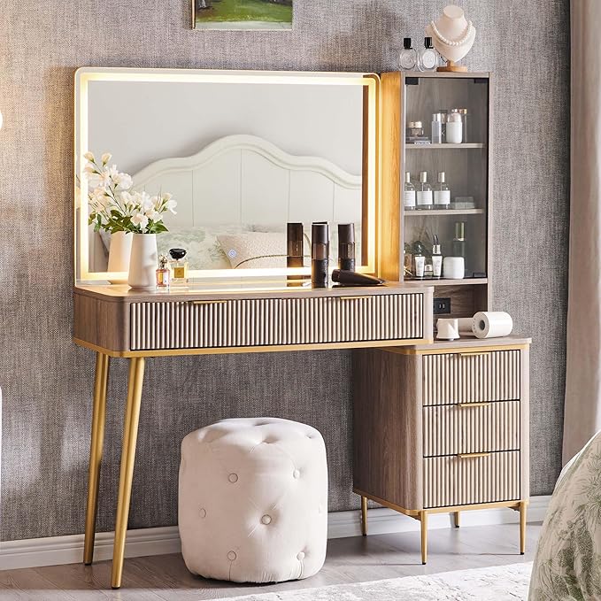 This modern makeup vanity desk combines style and functionality with a spacious 48-inch design. Featuring a 36-inch HD lighted mirror with adjustable brightness, this dressing table provides optimal lighting for makeup application and grooming. The fluted design adds elegant texture, while the glass top protects the surface and creates a sophisticated look.