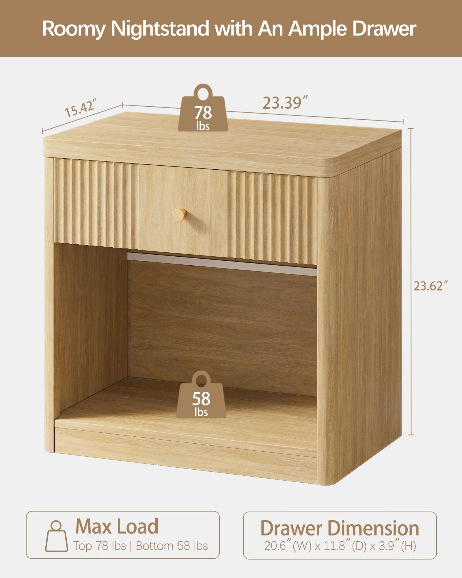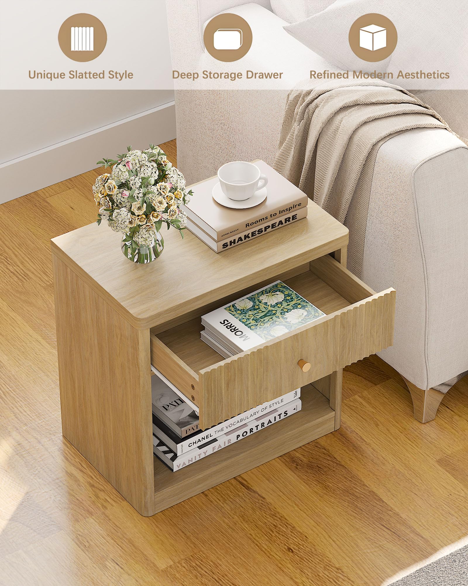 A stylish companion for your bedroom with vertical fluted front and warm oak finish. This nightstand adds charm and function to your bedside, keeping essentials within reach while creating a calm, cozy, and clutter-free corner.
