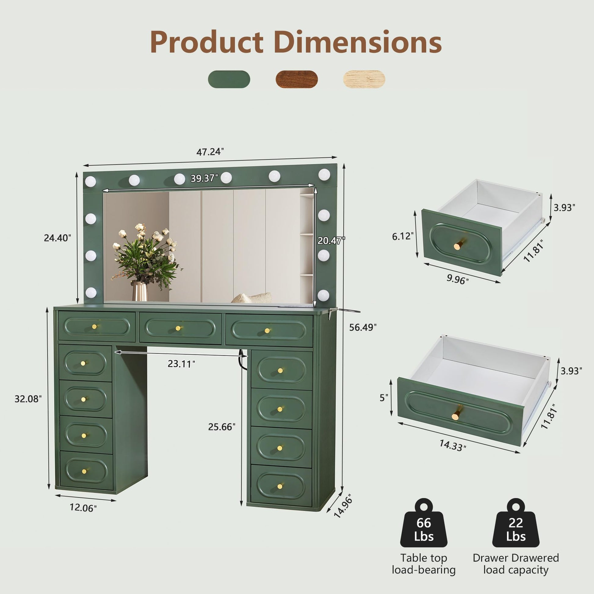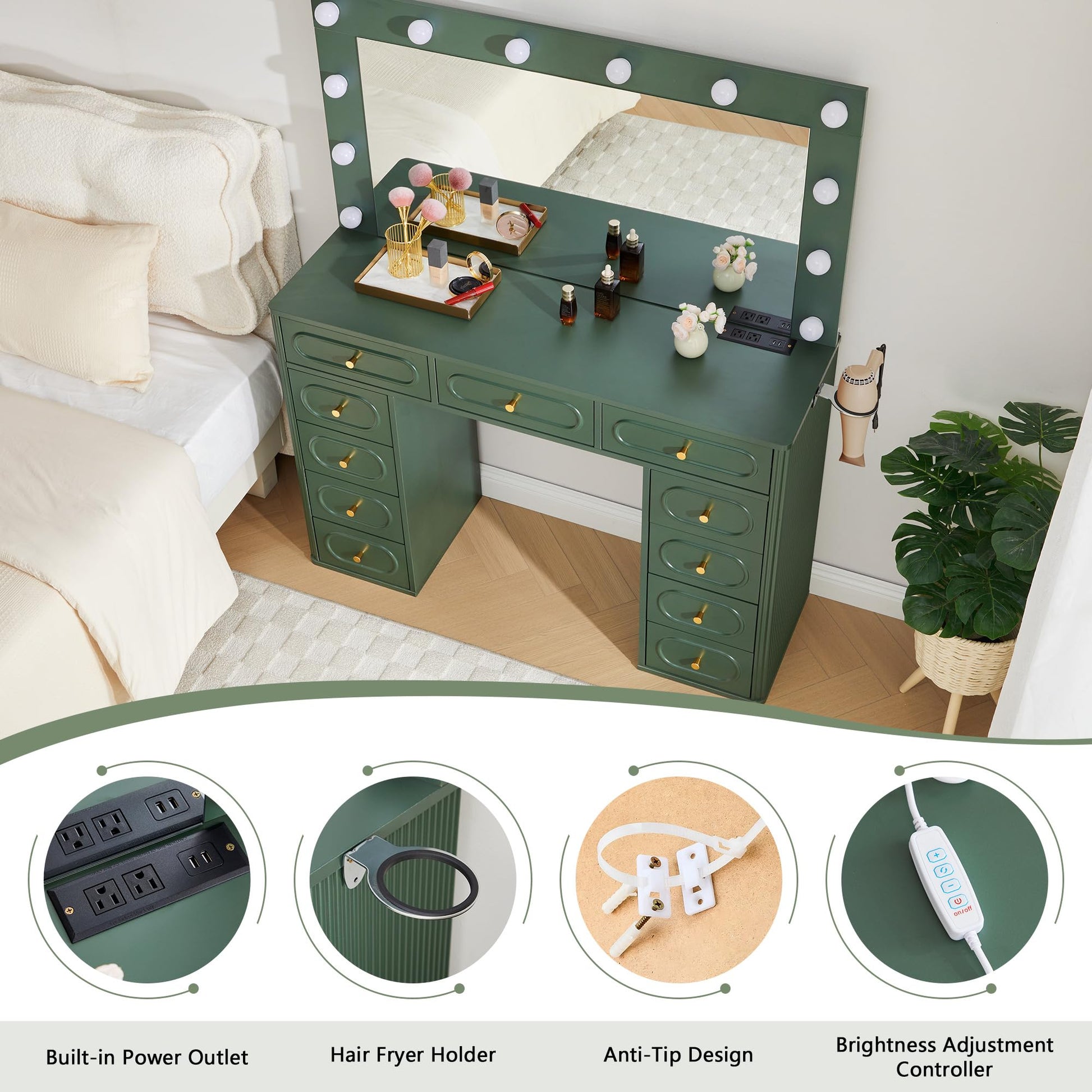 Fluted Vanity Desk with LED Mirror and 11 Drawers