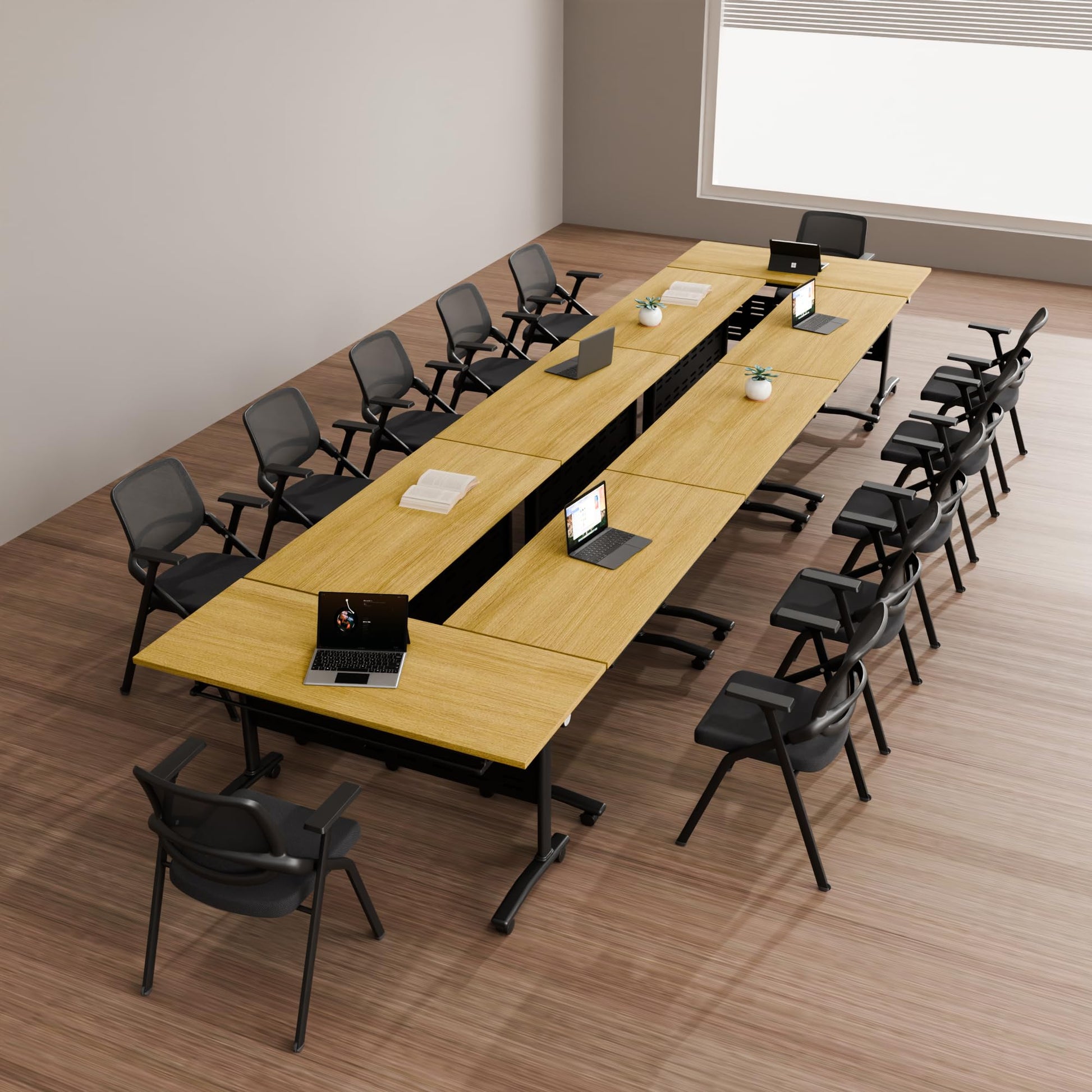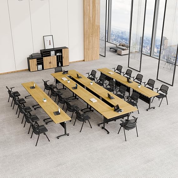 Modern folding conference table with flip-top design and silent rolling wheels. Perfect for training rooms, boardrooms, meeting spaces, and classrooms. Features natural wood finish with sturdy metal frame construction.