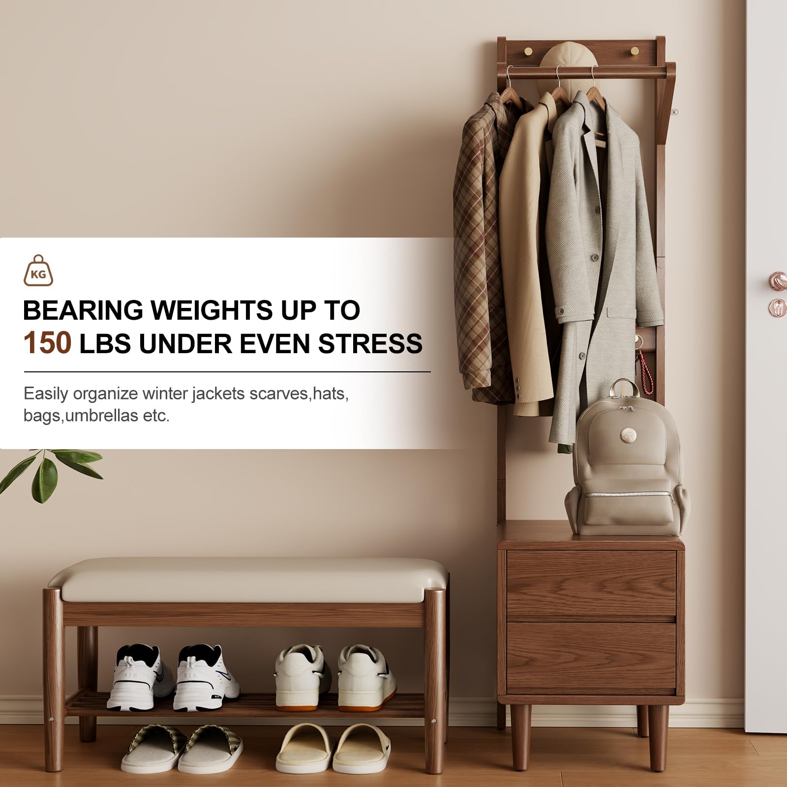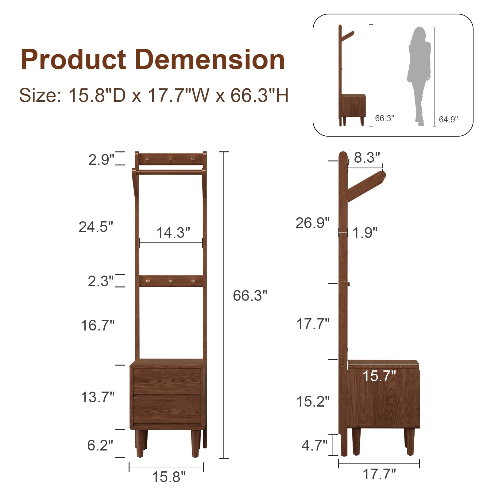 Elevate your entryway organization with this versatile freestanding coat rack that combines hanging storage with drawer space. Crafted from solid wood with a rich walnut finish, this multifunctional hall tree provides a complete storage solution for coats, accessories, and everyday essentials.