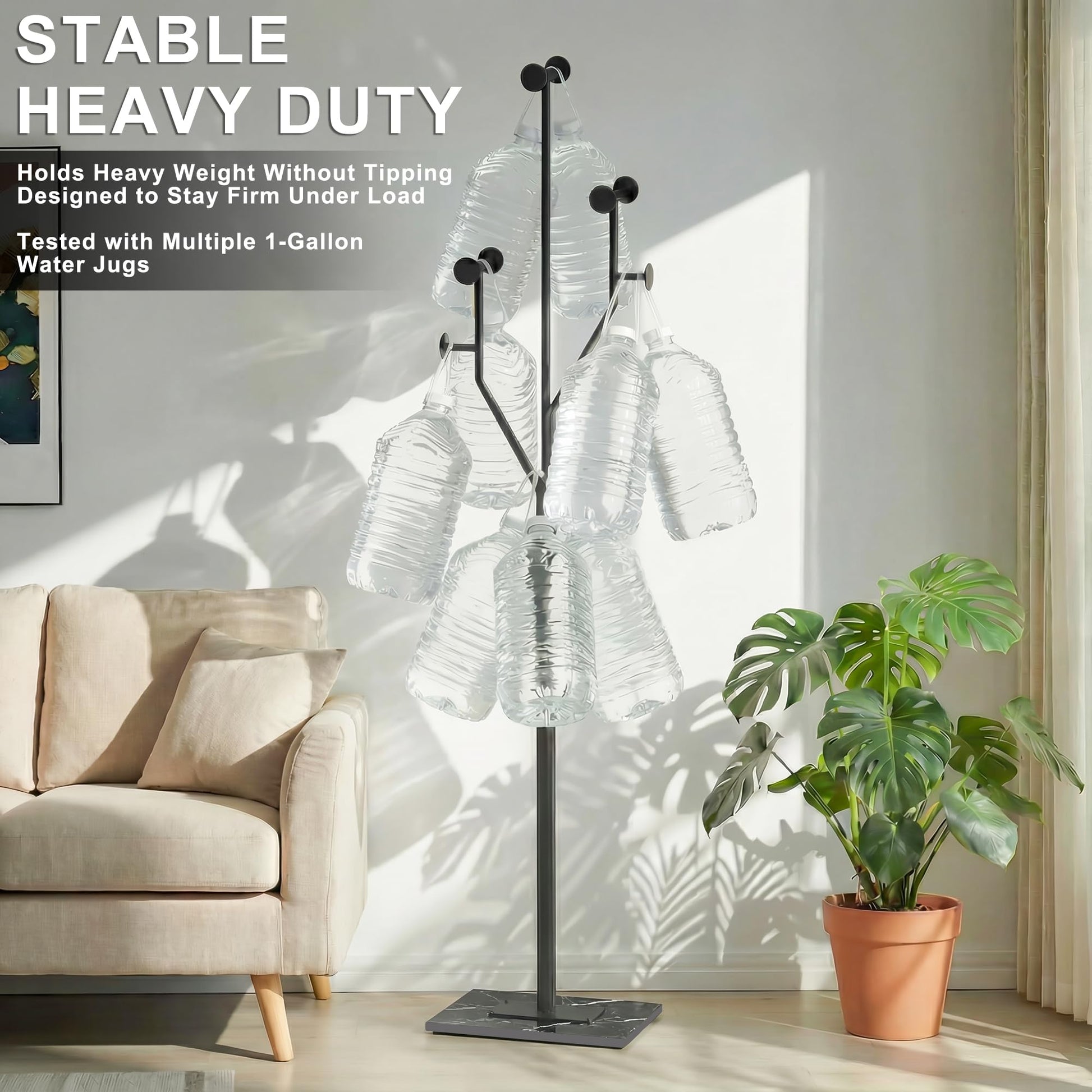 Modern standing coat rack designed for entryway, bedroom, office, and hallway organization. Features a sturdy marble base for stability and a sleek black metal construction with space-saving vertical design.