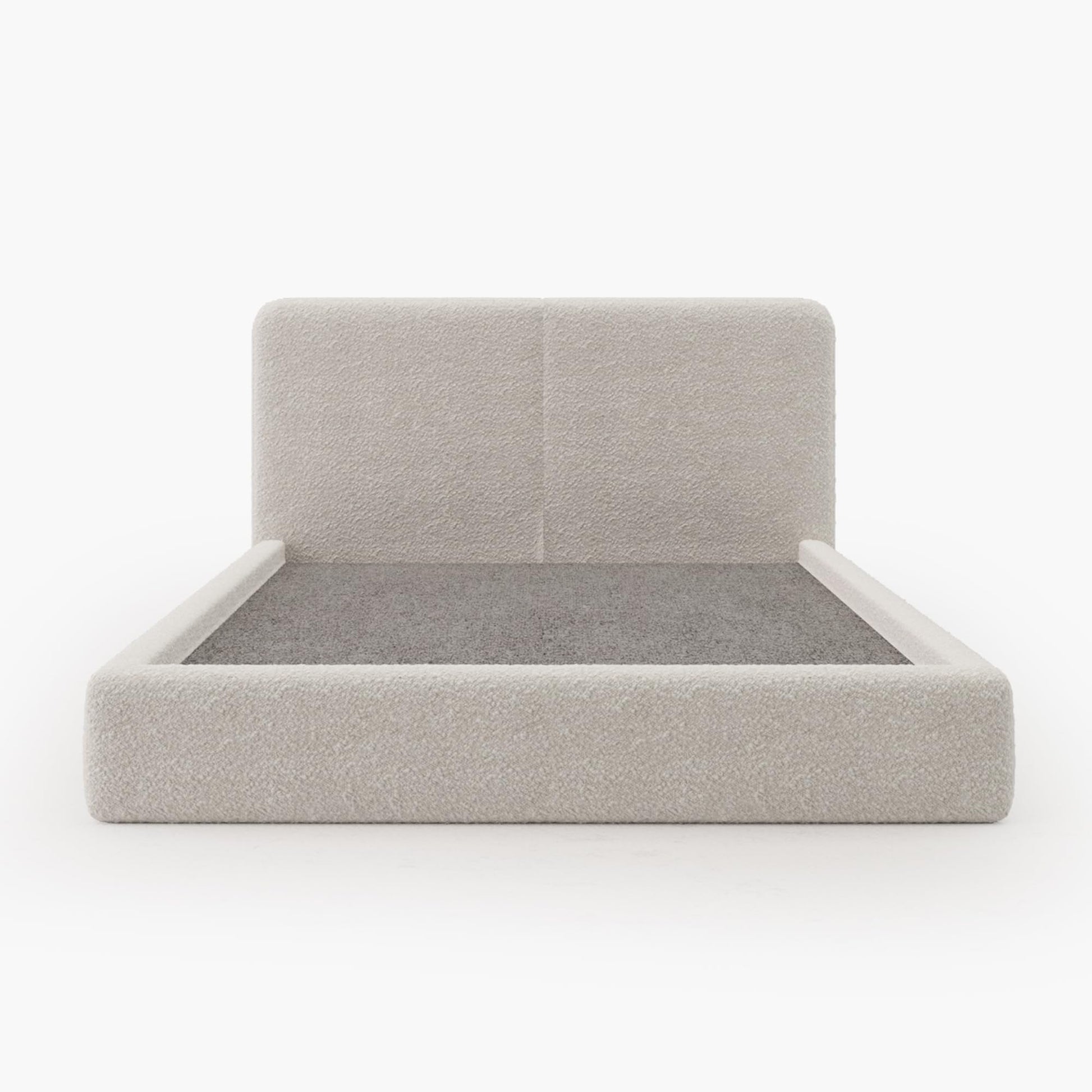 The integrated headboard provides excellent back support for reading or relaxing, while the sturdy platform foundation eliminates the need for a box spring. The soft, textured boucle fabric in pristine white adds a sophisticated touch that complements any bedroom décor.