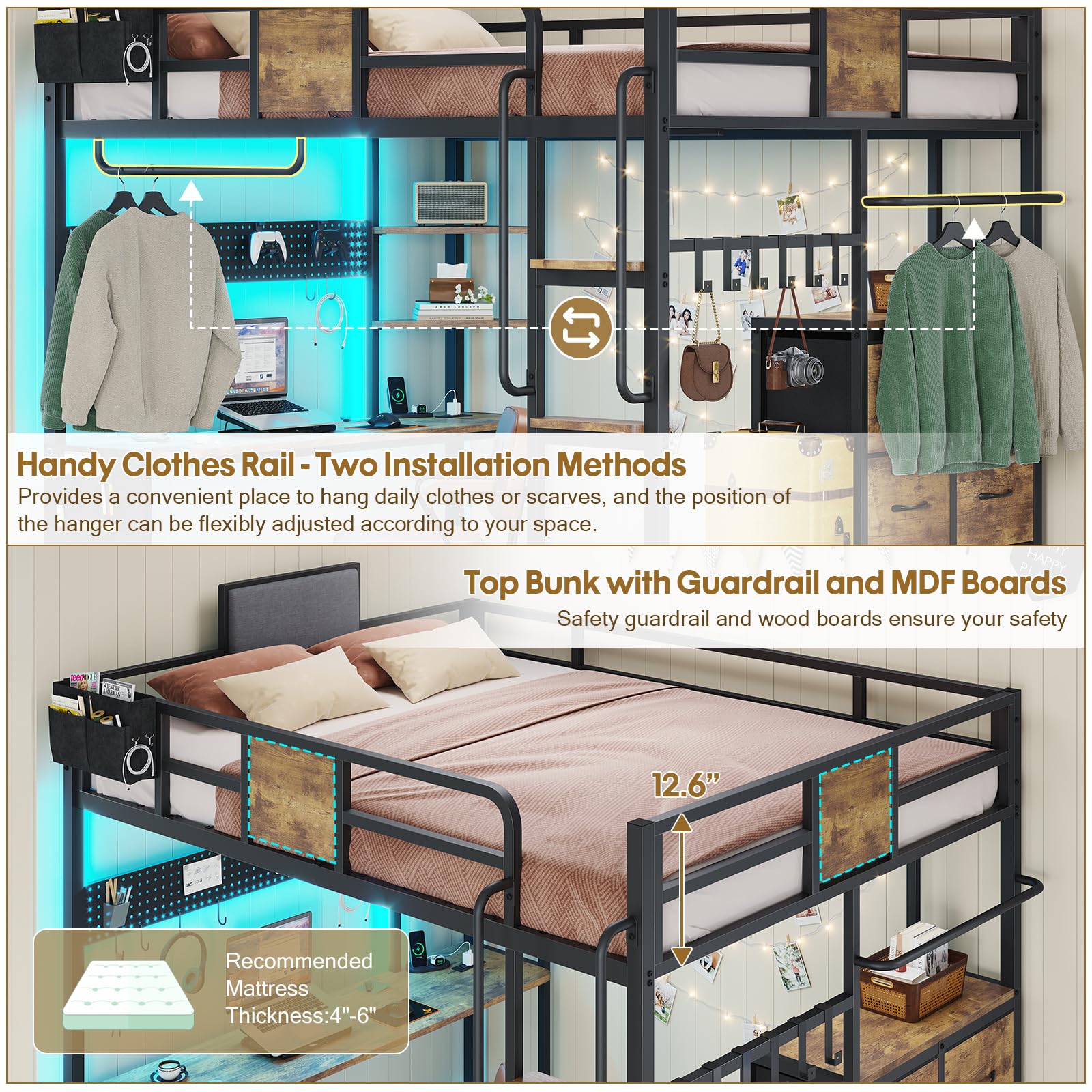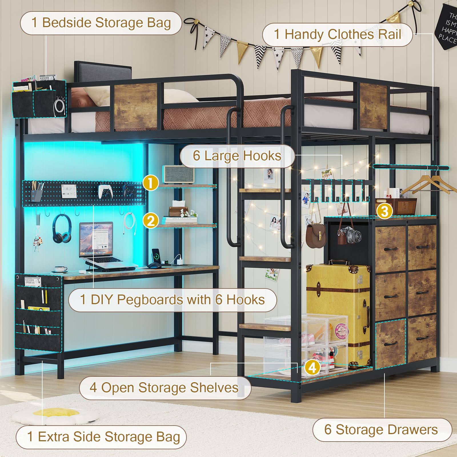 - Multifunction Storage Space: Includes 6 large storage drawers, 4 open shelves, 1 DIY pegboard, 9 iron hooks, 1 bedside storage bag, 1 side storage bag, and 1 clothes hanging rail for comprehensive organization