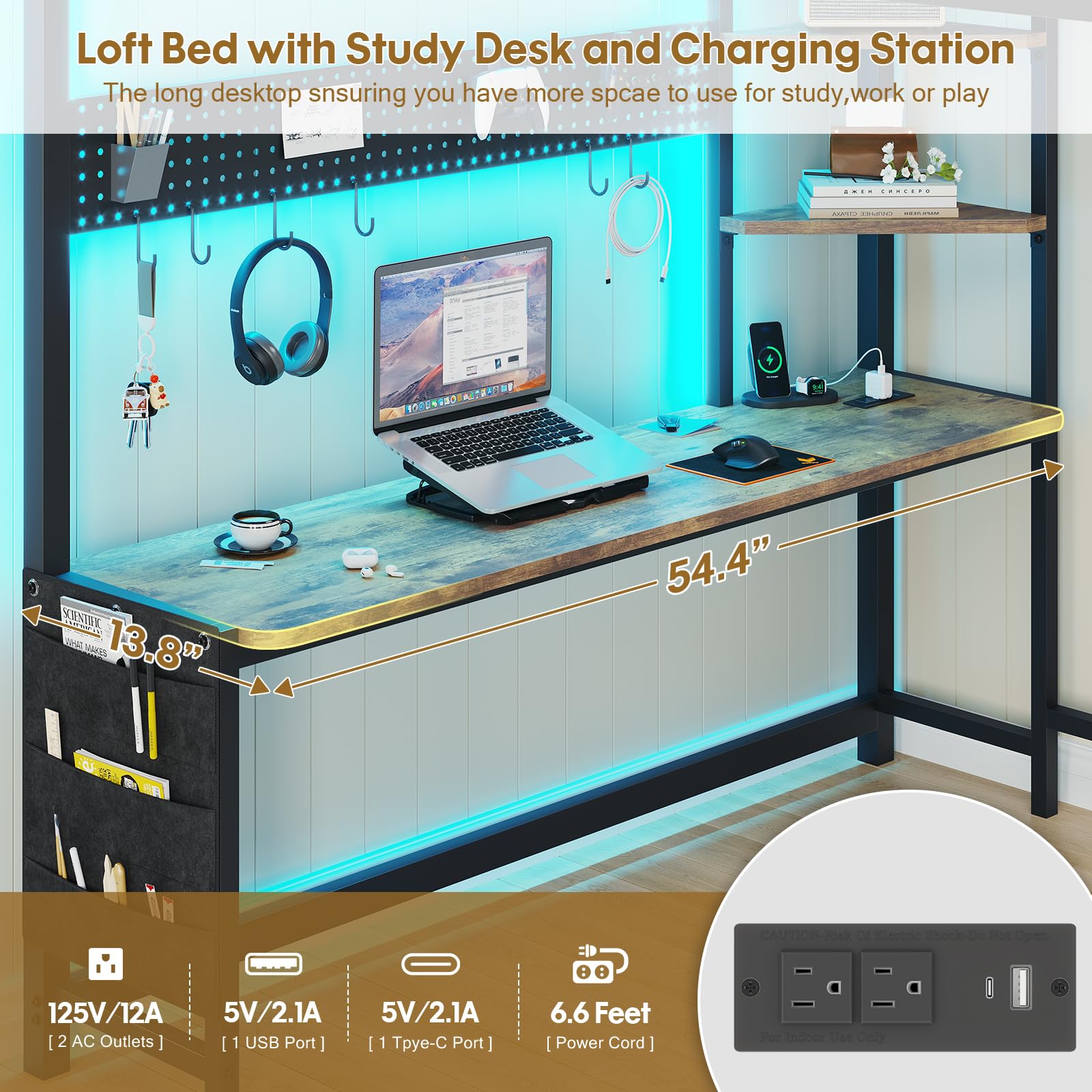 - Charging Station: Built-in power hub with 2 standard outlets, 1 USB port, and 1 Type-C port for convenient device charging