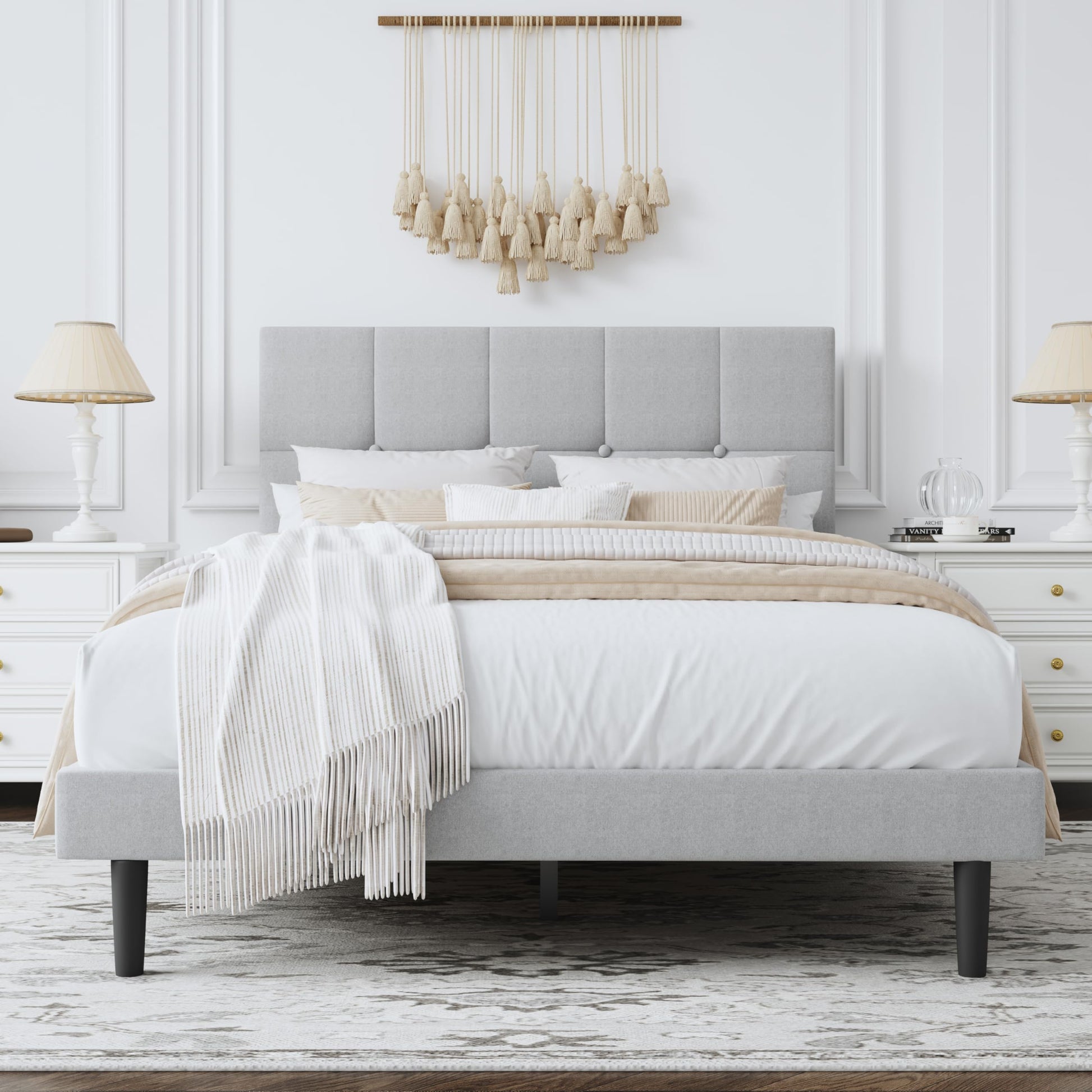 This full size platform bed frame combines modern elegance with exceptional durability. The fabric upholstered headboard features diamond button tufting, creating a sophisticated focal point for your bedroom.