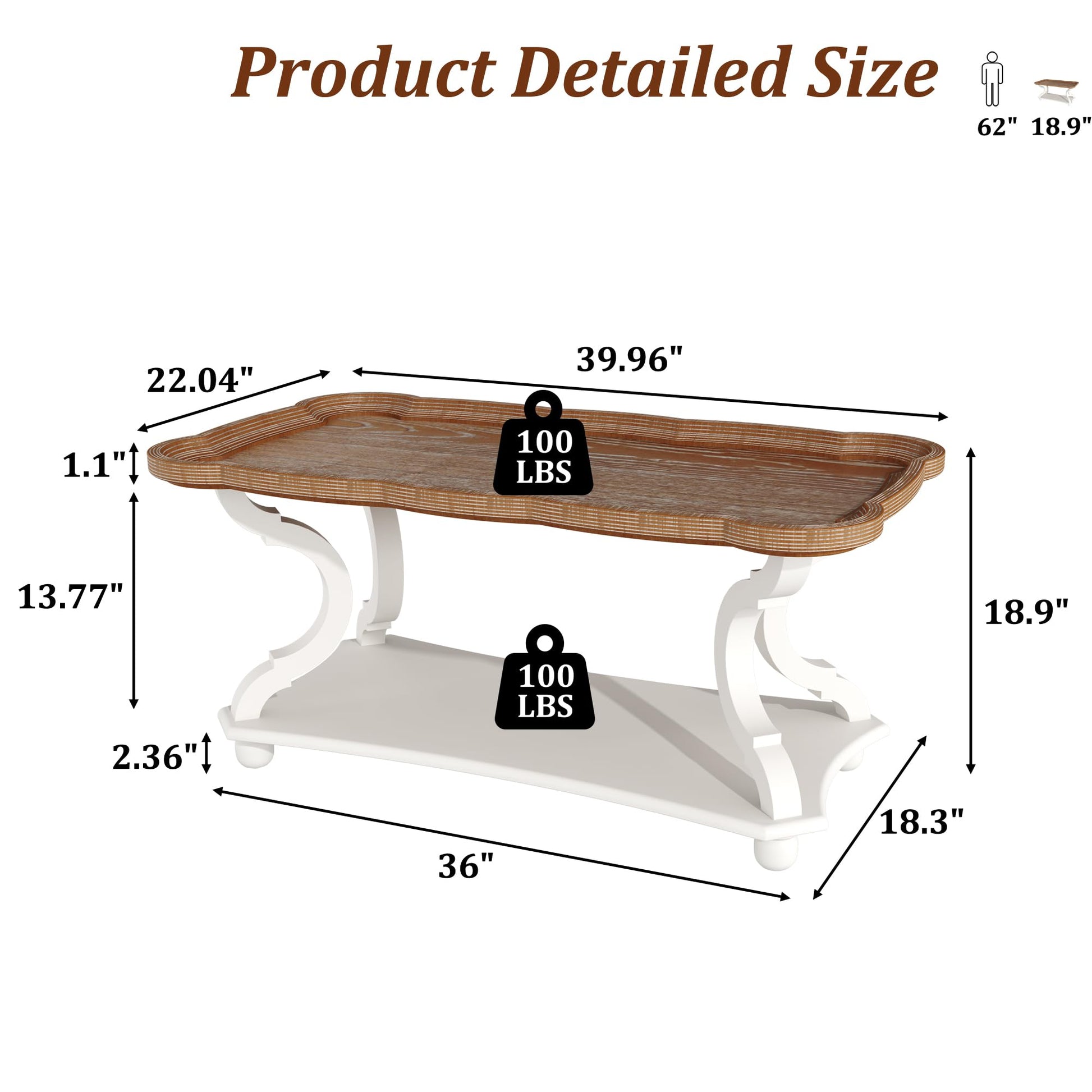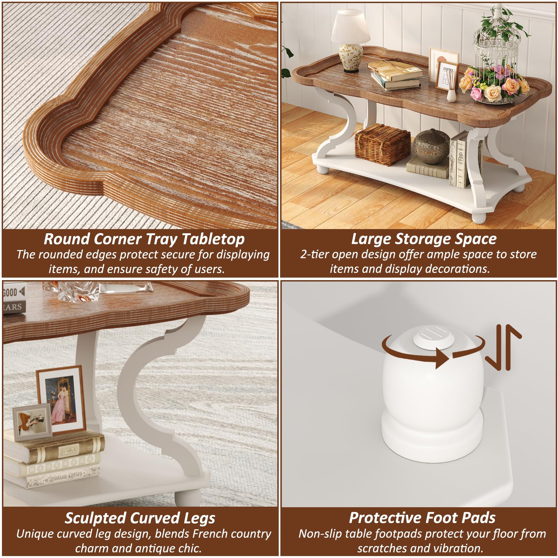 Function Home Farmhouse Coffee Table, 2-Tier Center Table with Storage Shelf, 39.8" French Country Rectangle Accent Table with Natural Tray Top and Curved Legs for Living Room Balcony, Vintage White