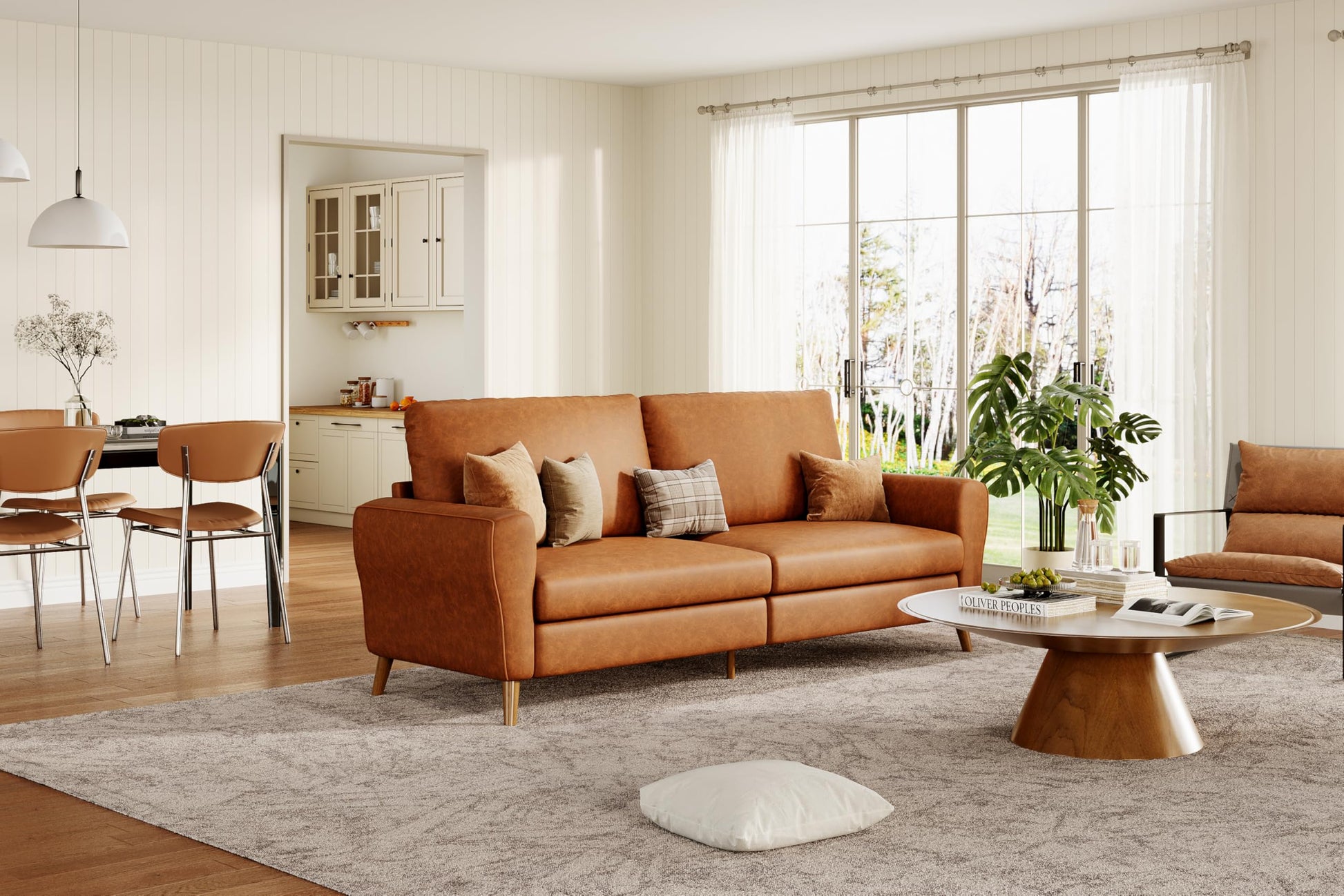 GarveeHome 84 in Faux Leather Couch, Brown Couches for Living Room, 3 Seater Sofa with Wide Armrests, Wood Legs, Deep Seats, Mid-Century Modern Loveseat Sofa for Small Spaces, Easy Assembly