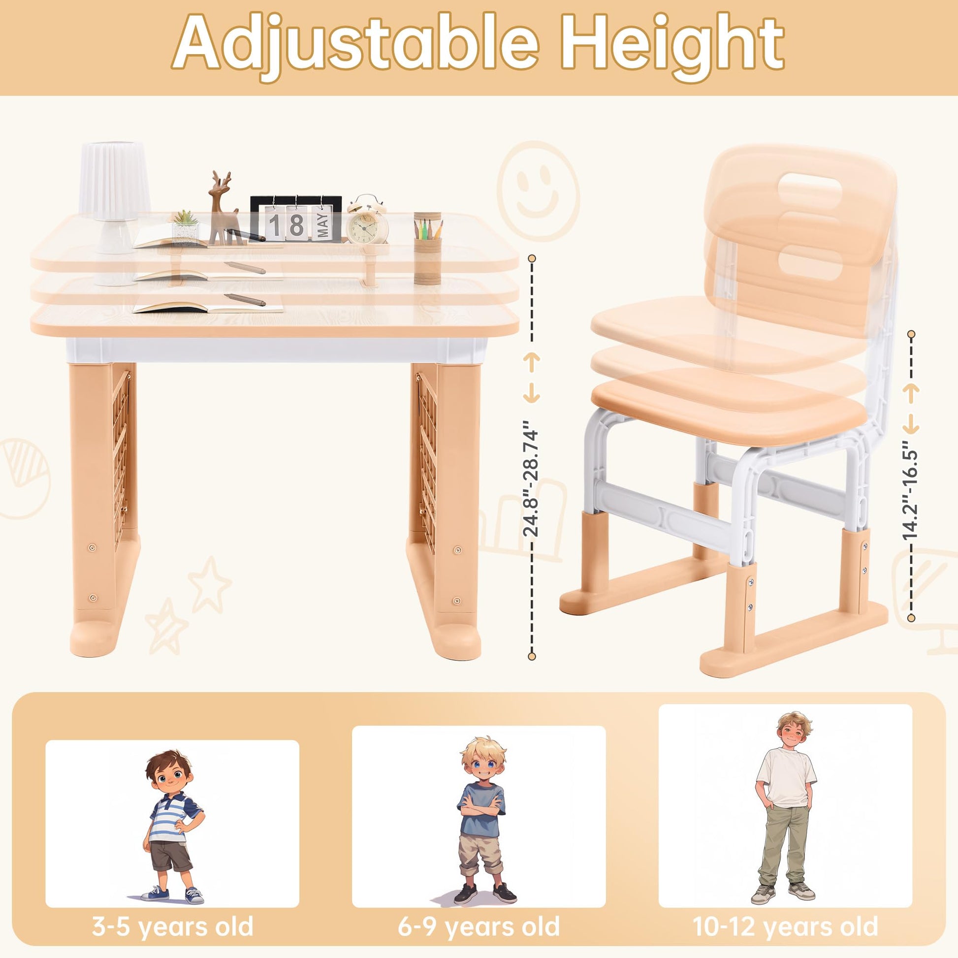 - 【Height Adjustable】This kids desk and chair set is ideal for growing children, with both the chair and desktop adjustable to provide the most suitable and ergonomic fit. The kids table height can be adjusted from 24.8 inches to 28.7 inches and the chair height can be adjusted from 14.2 inches to 16.5 inches, helping to adjust your child's sitting posture and ensuring comfort during study or homework. This kids study table and chair set is suitable for children aged 3 to 12.
