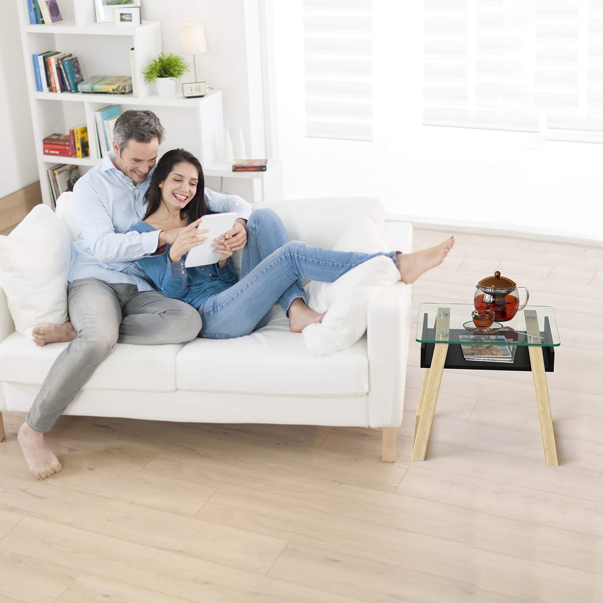 This modern square coffee table combines Scandinavian design with practical functionality. Featuring a thick safety glass top and sturdy bamboo legs, it creates a welcoming ambience in any living space while providing reliable stability even on carpeted surfaces.