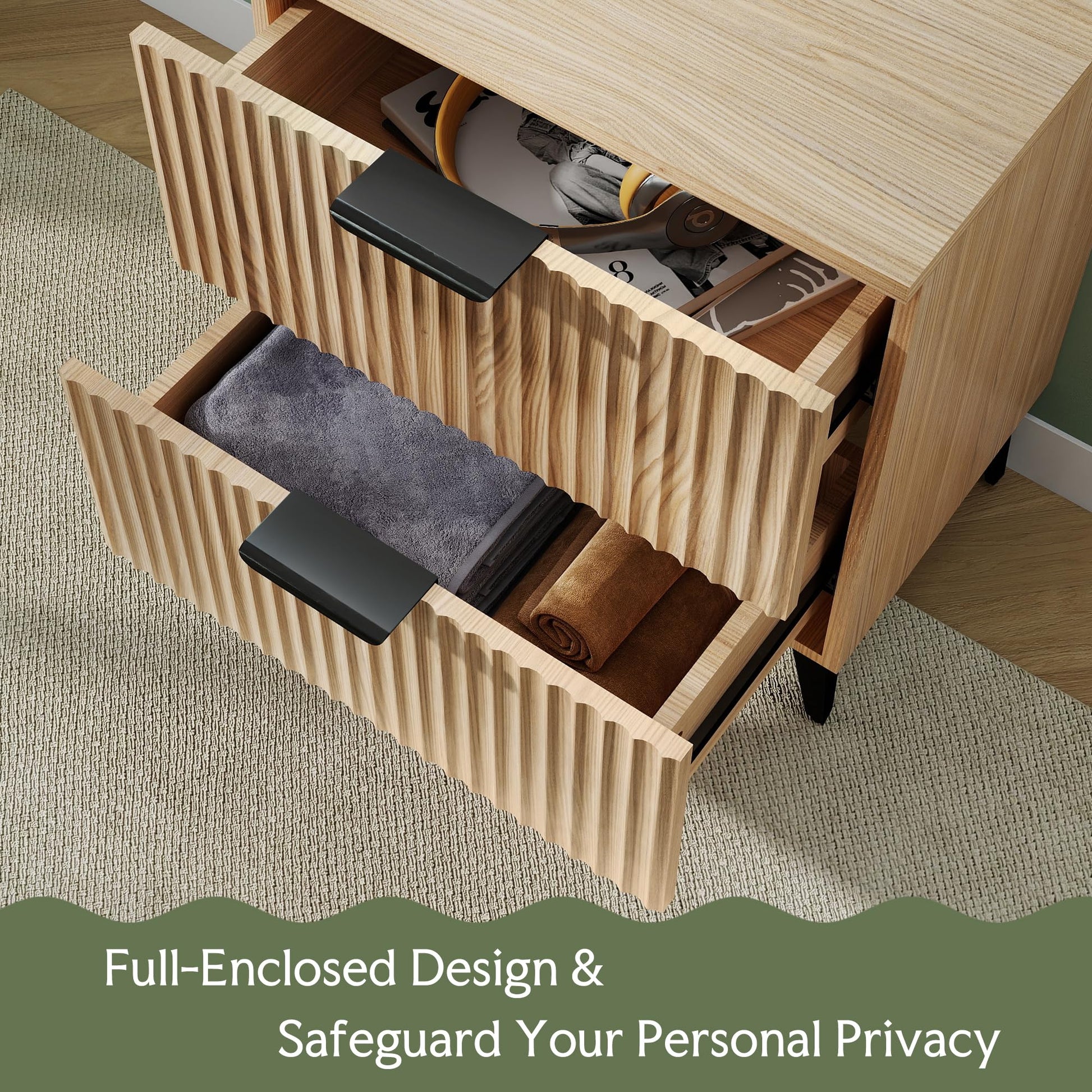 GRAINLLE Wood Night Stand Set 2 Fluted Dresser for Bedroom 2 Drawers End Tables Nightstands Set of 2, Storage Modern Bedside Table Set of 2, Oak Nightstand