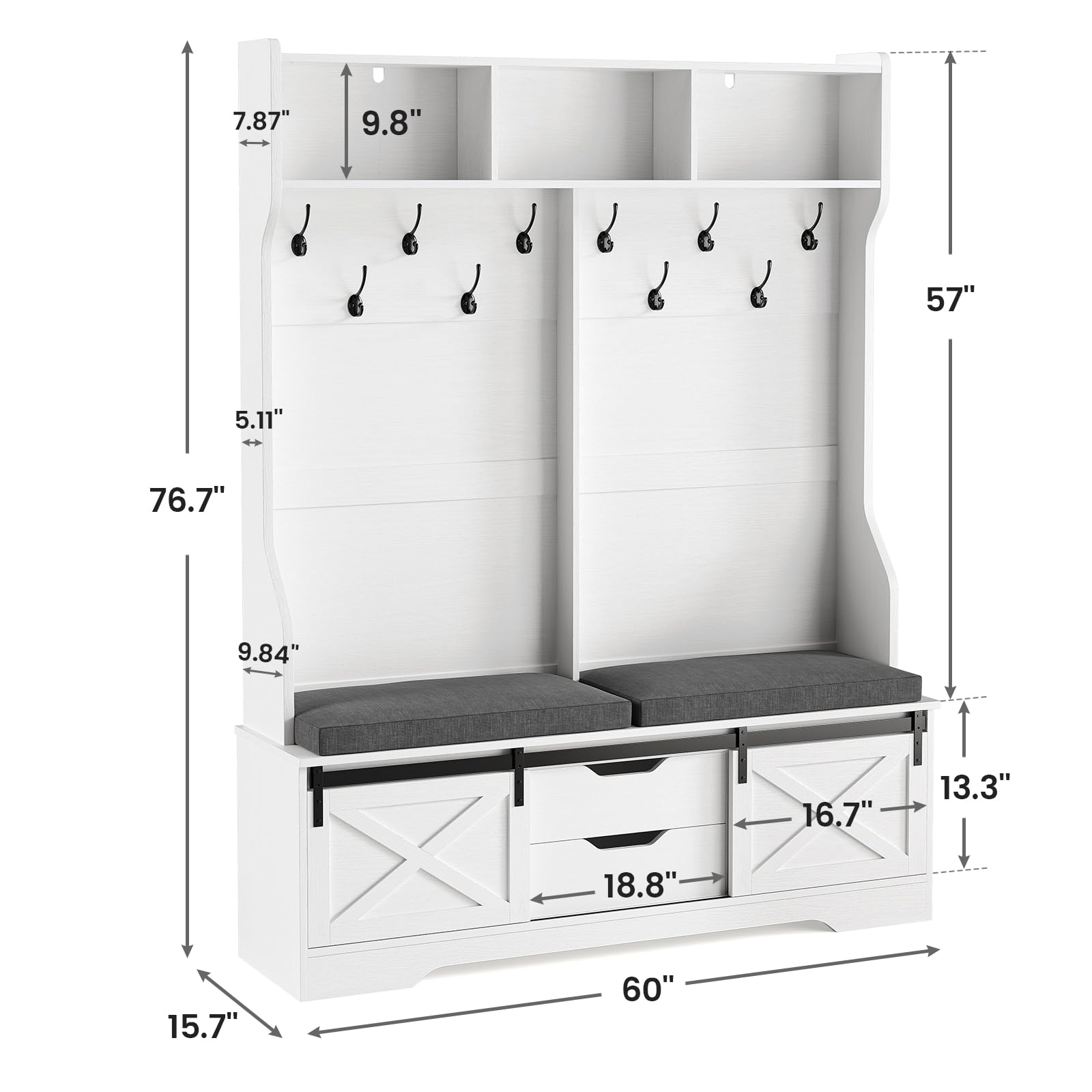 Transform your entryway with this versatile 3-in-1 hall tree featuring a coat rack, shoe storage cabinet, and cushioned bench. The modern farmhouse design with sliding barn door combines functionality with rustic charm, perfect for organizing hallways, mudrooms, or living spaces.