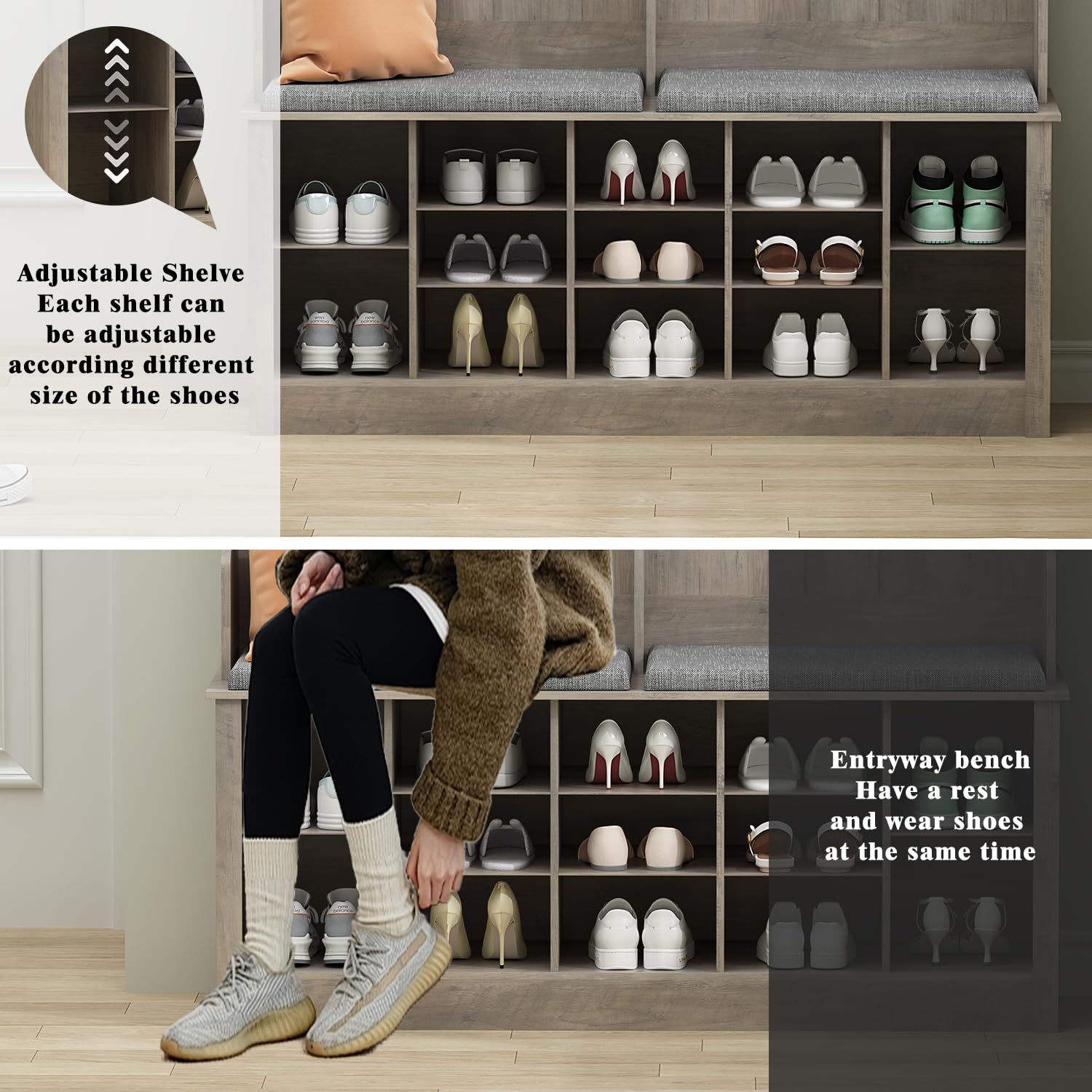 Transform your entryway with this versatile 4-in-1 mudroom storage organizer that combines a coat rack, bench, shoe storage, and adjustable shelving in one farmhouse-inspired piece.