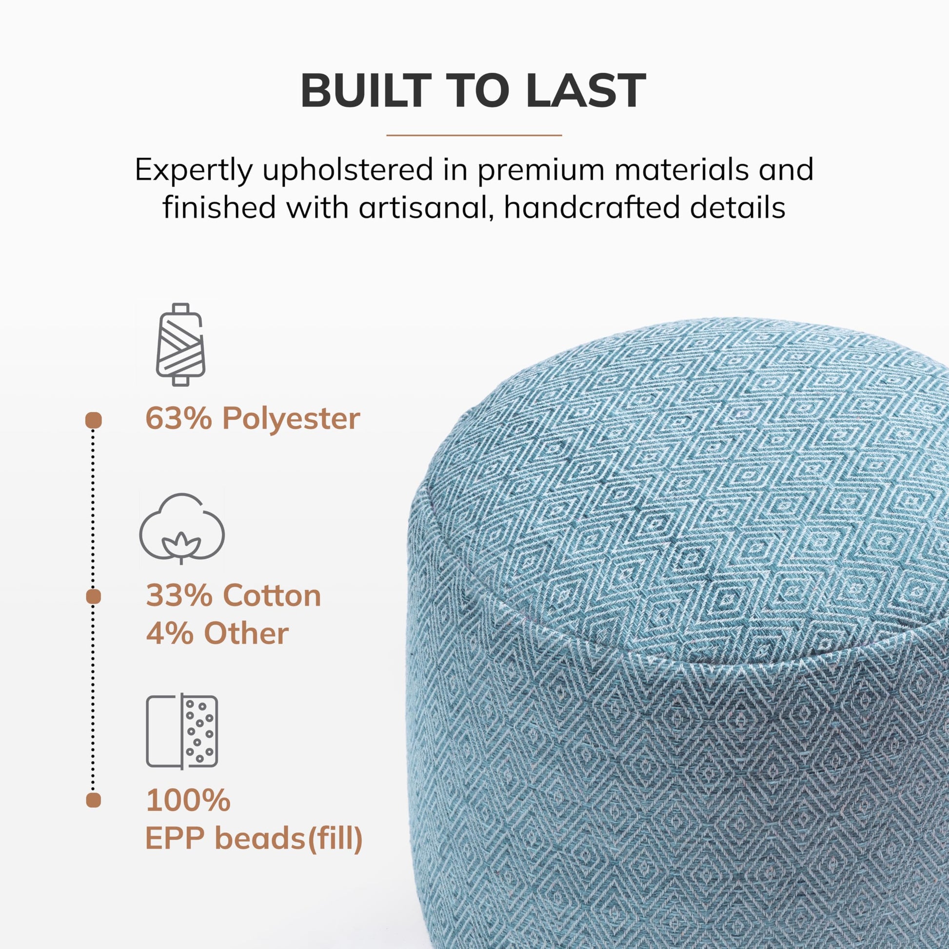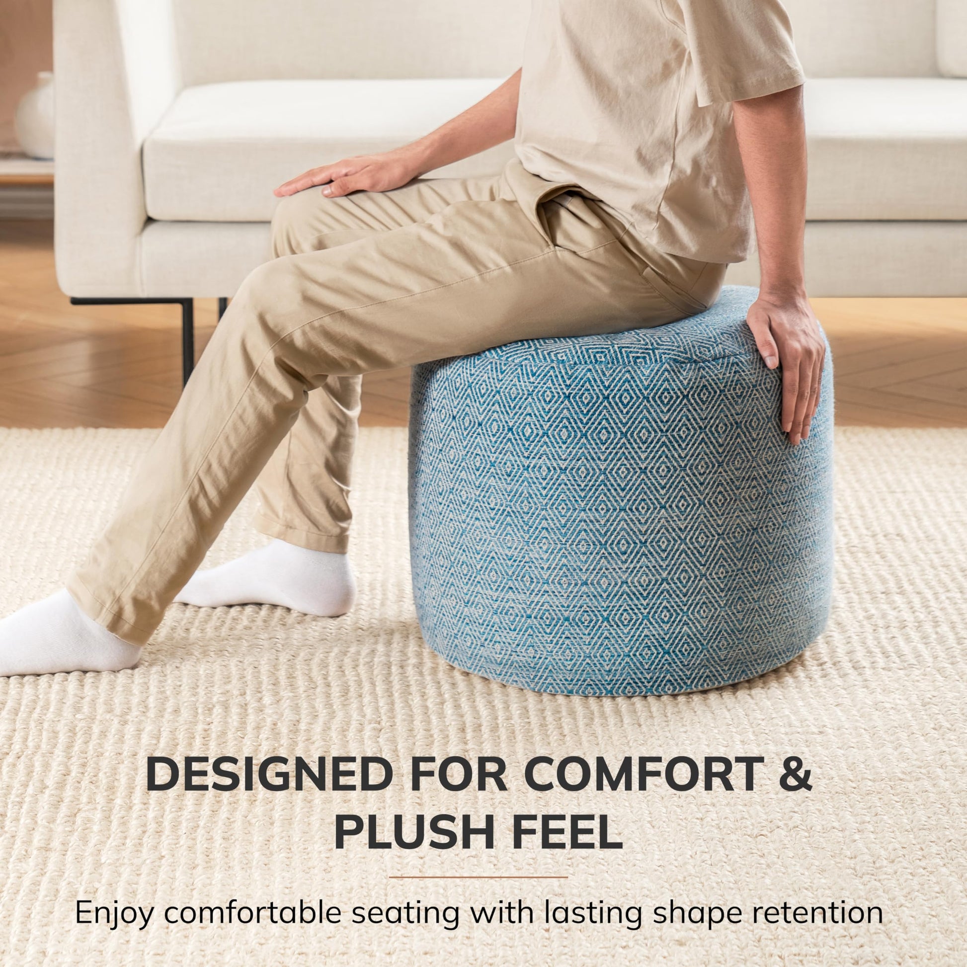 This handmade pouf ottoman serves as a versatile footrest and decorative accent piece for your living room, bedroom, nursery, or patio. Each piece is 100% handcrafted, ensuring unique character and quality construction.