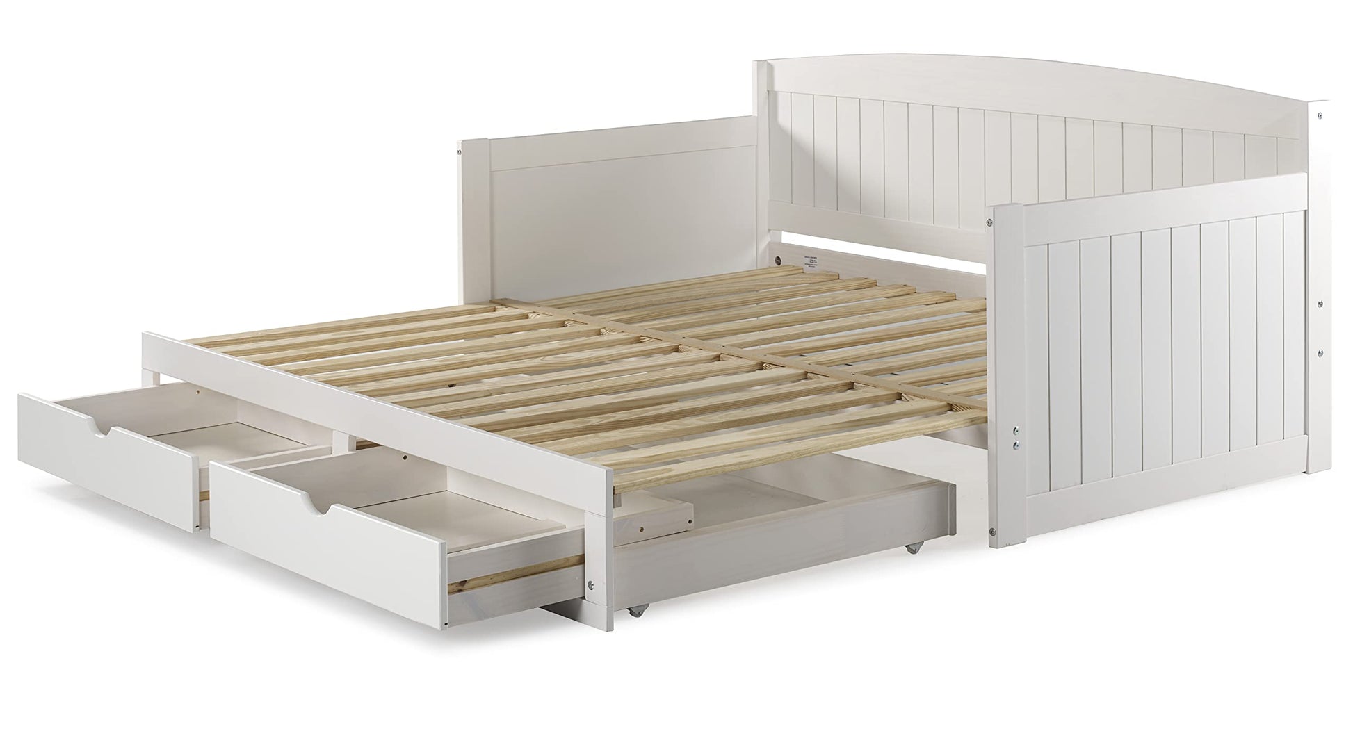 Transform any room with this versatile solid wood daybed featuring a pop-up trundle and two pull-out storage drawers. Designed for maximum functionality, this daybed converts from twin to king size, making it perfect for kids' rooms, guest rooms, or living spaces.