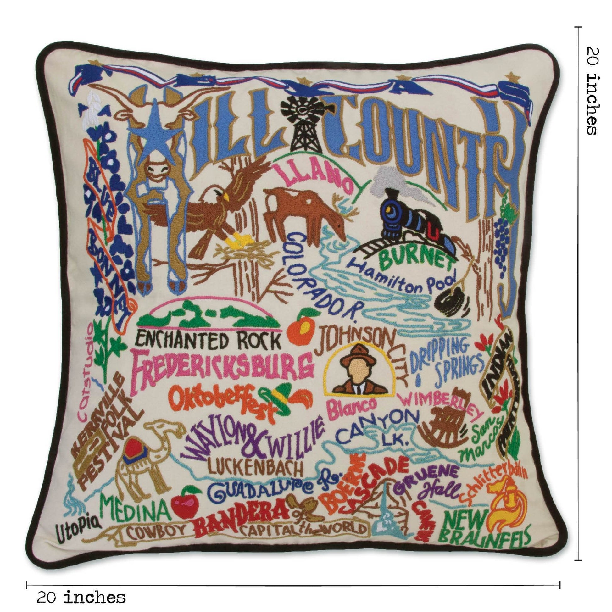 Bring the charm of Hill Country into your home with this hand-embroidered decorative throw pillow. Each piece is meticulously crafted by skilled artisans, taking approximately one week to complete. The pillow features original hand-drawn artwork that captures the essence of Hill Country with authentic detail and local perspective.