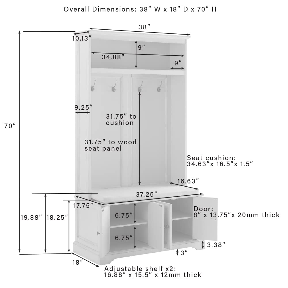 The Holbrook Hall Tree brings vintage charm to any entryway with its hand-rubbed distressed white finish and recessed paneling. This versatile storage solution features a built-in cushioned bench, dual shoe cabinets, and four double-prong coat hooks to keep your everyday items organized and accessible.