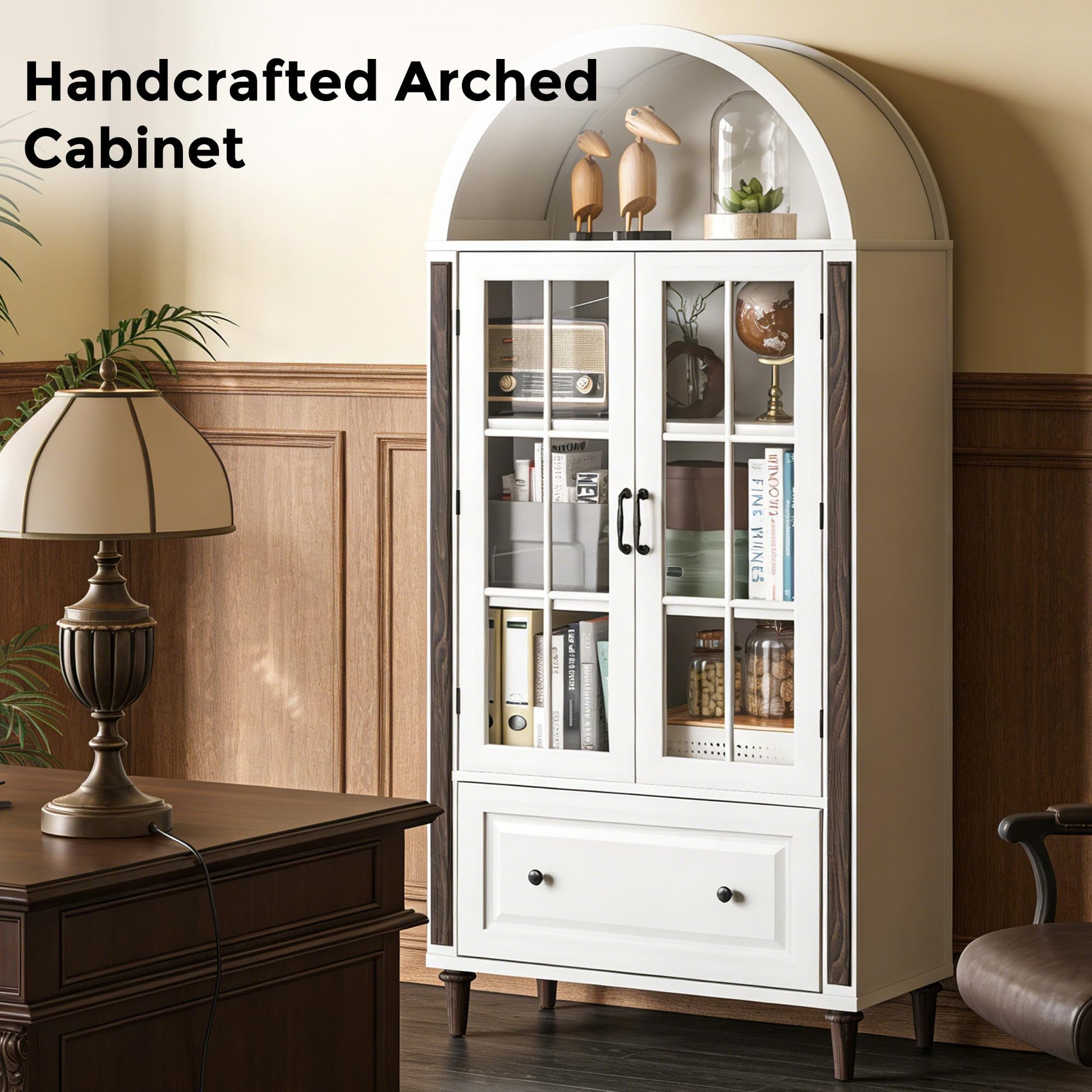 - 【Handcrafted Design with Smart Storage Solutions】 This arched bookcase features a sculpted arch top, hand-applied trim details, tempered glass doors, adjustable interior shelves, and a smooth-gliding drawer—built to store, display, and organize beautifully.