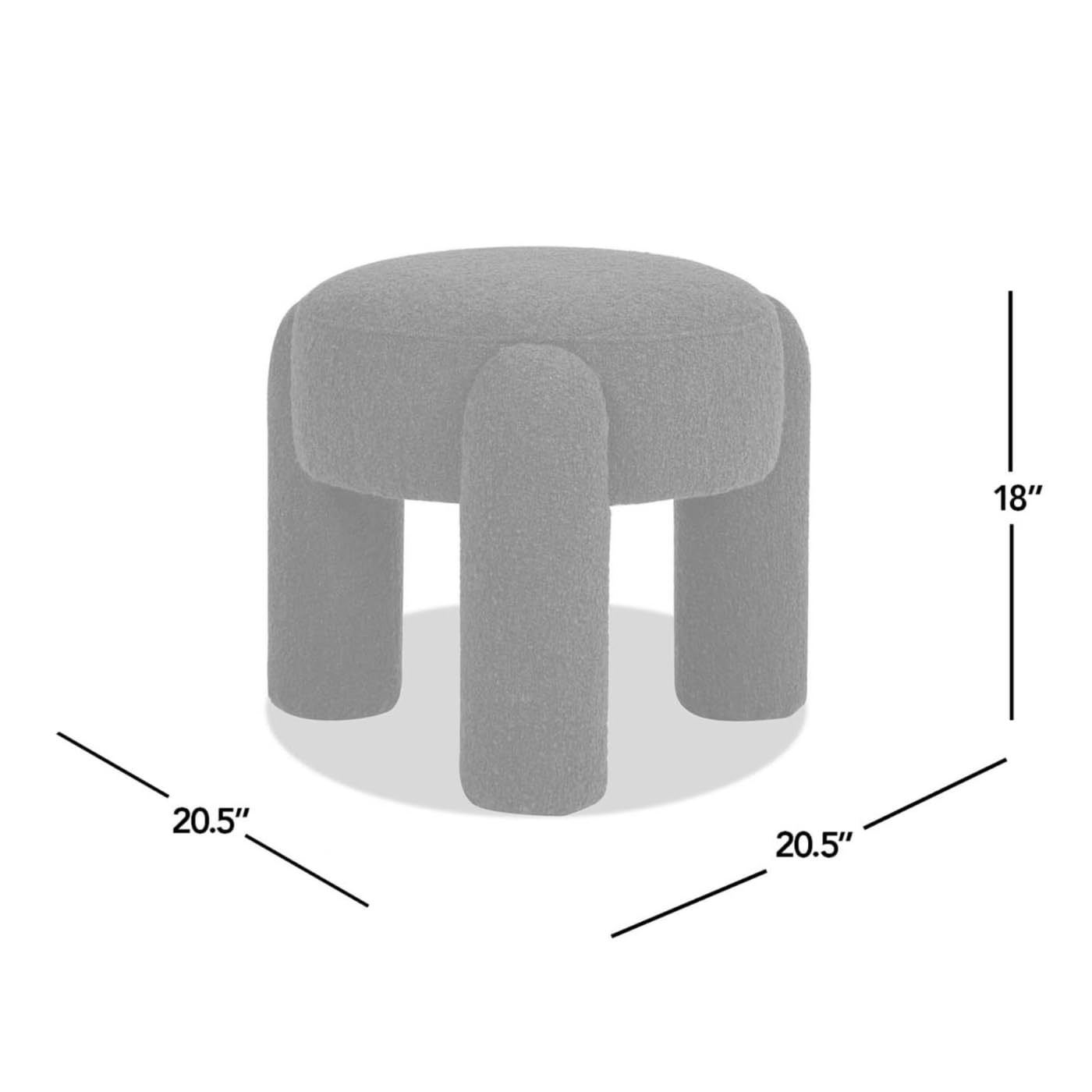 Perfect for injecting a dose of fun into a living room arrangement or a kid's room, this ottoman serves as both a comfortable seat and a whimsical accent. The contemporary 3-legged design merges modern aesthetics with functional charm, while the fun and cozy textured boucle upholstery is sherpa-like in its soft and tactile appeal.