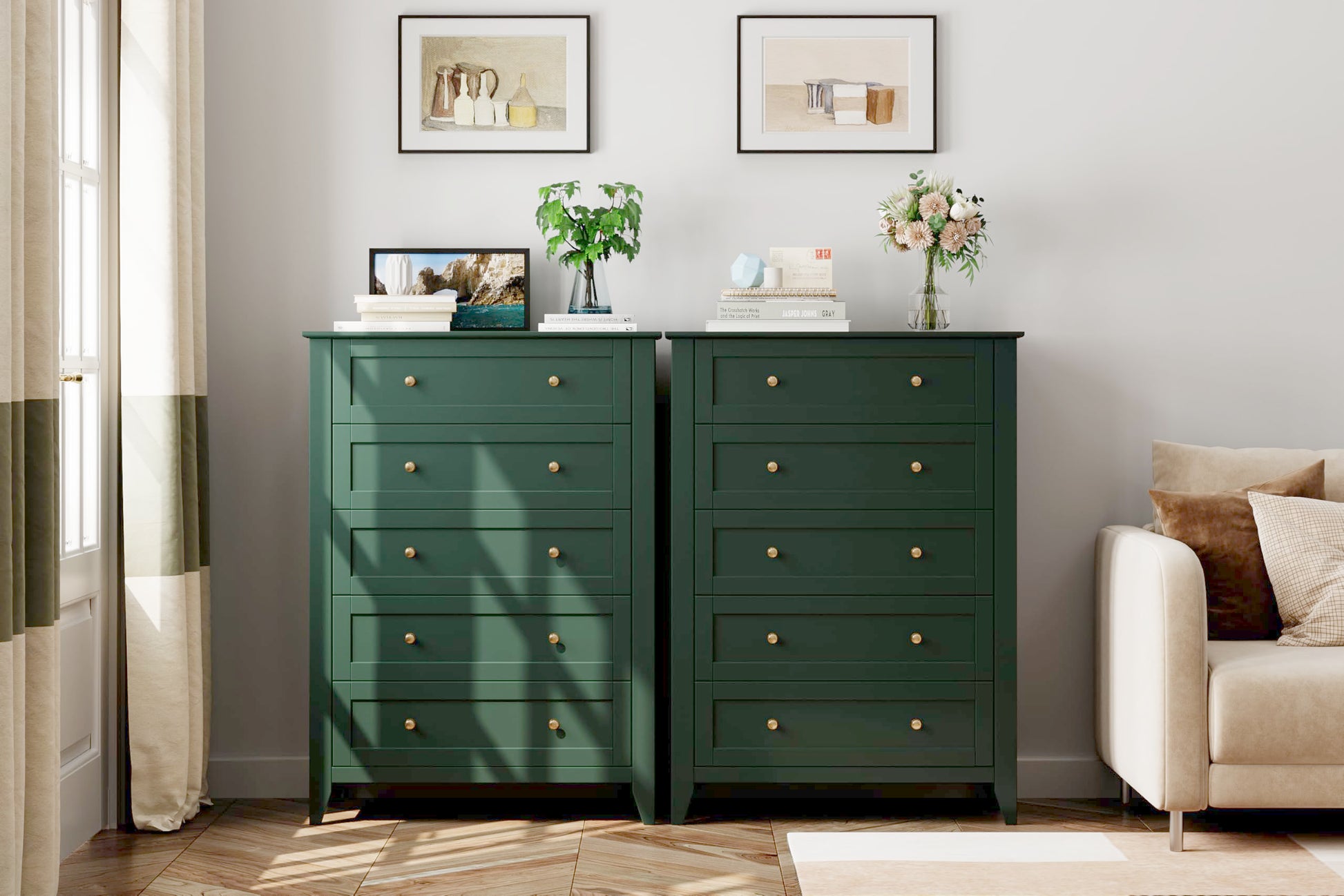 Details: IDEALHOUSE Green 5 Drawer Dresser for Bedroom, Tall Dresser with Deep Drawers & Metal Knobs, Modern Wooden Chests of Drawers for Entryway, Hallway