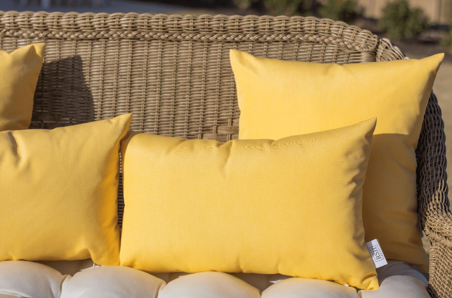Transform your indoor and outdoor spaces with this premium 4-piece throw pillow set crafted from durable Sunbrella Canvas fabric in a vibrant Buttercup Yellow shade. This versatile collection includes two square pillows and two rectangle pillows, perfect for mixing and matching on sofas, chairs, benches, or patio furniture.