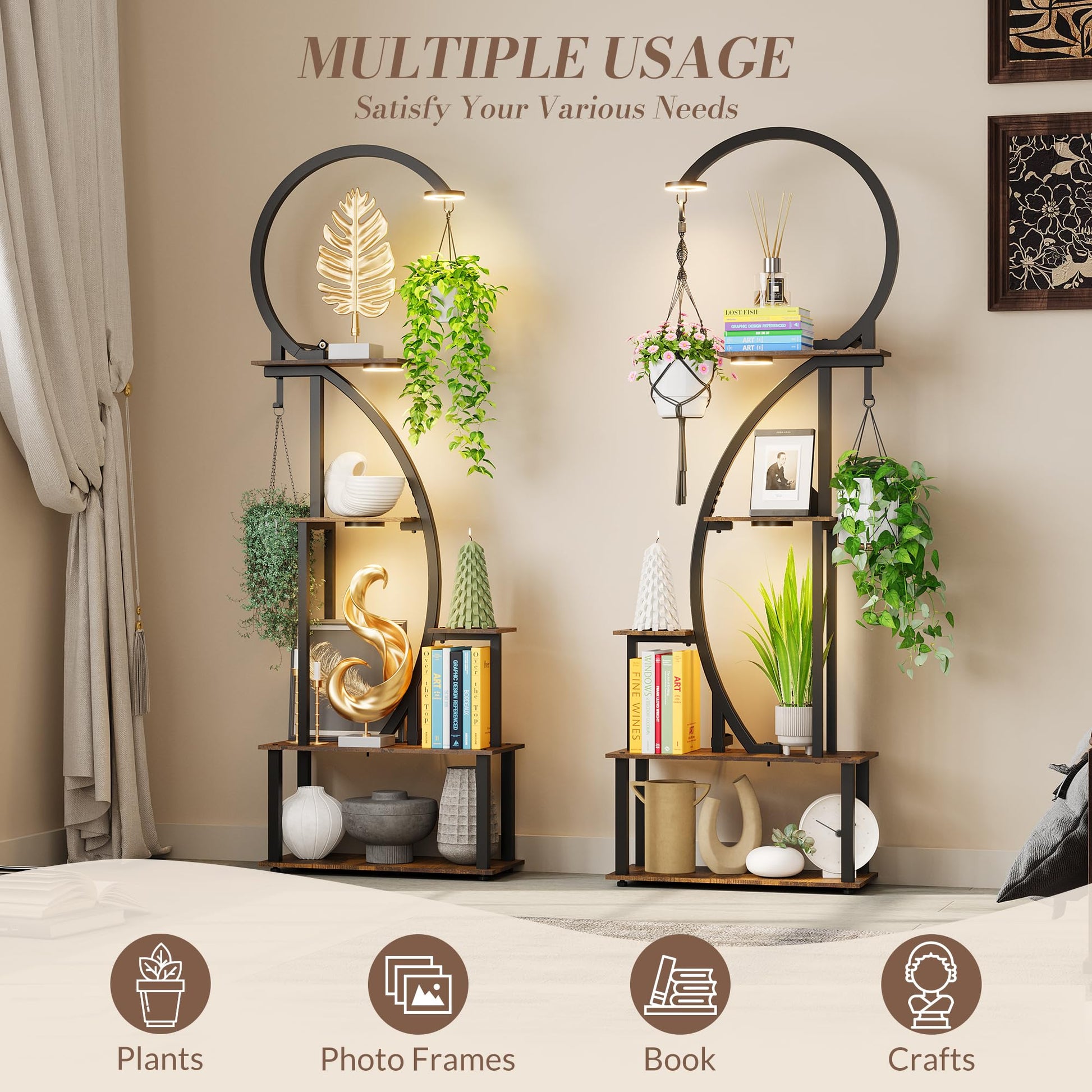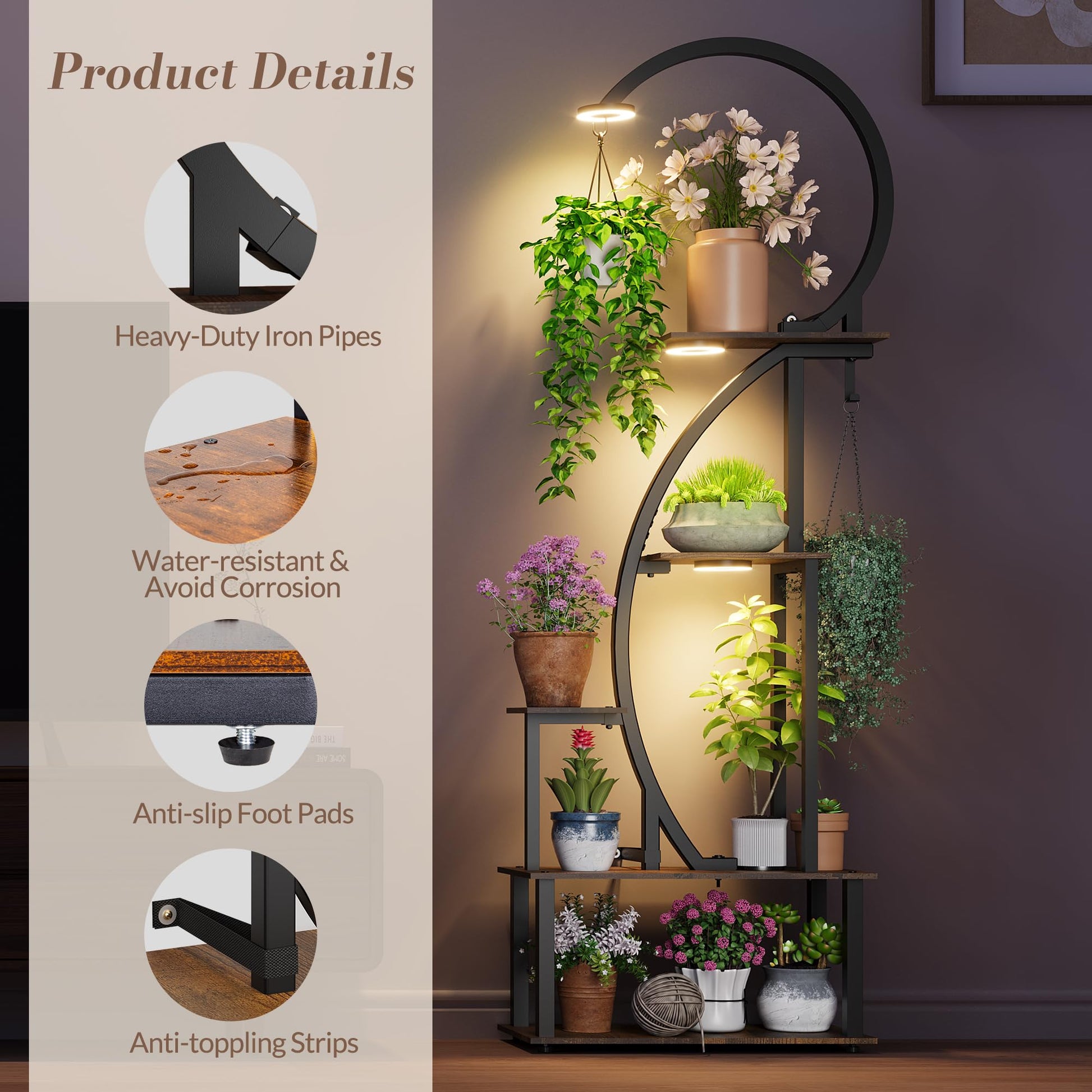 Energy-efficient LED lights eliminate the need to move plants outdoors, promoting plant health while enhancing your living space ambiance. The tiered design ensures each plant receives better light exposure. Assembly is quick and easy with included tools and illustrated instructions. Furniture straps are provided for wall anchoring to prevent tipping.