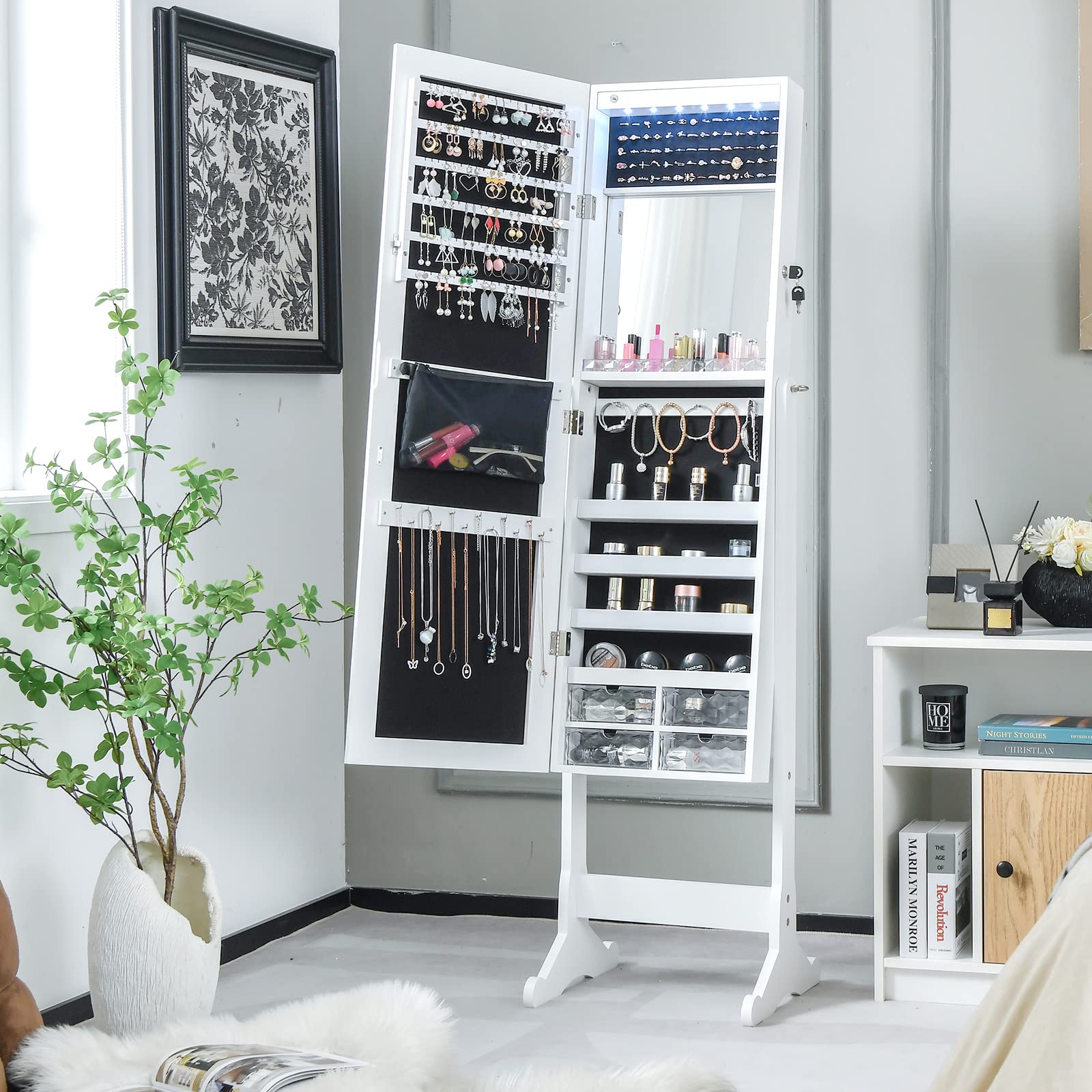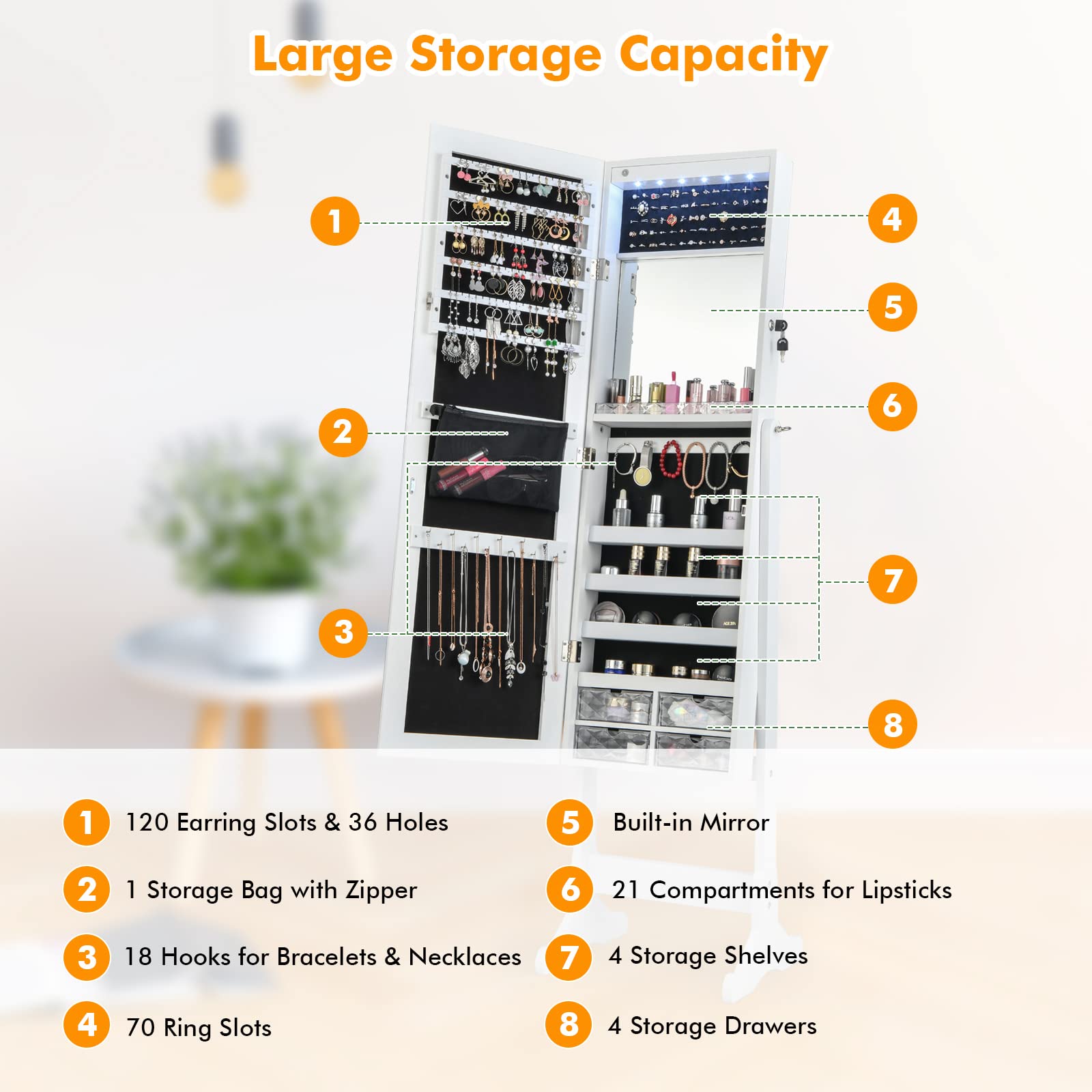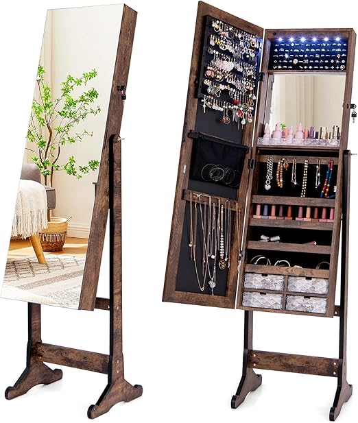 Transform your jewelry storage with this elegant standing jewelry armoire featuring a full-length mirror and integrated LED lighting. This lockable jewelry organizer combines functionality with style, offering comprehensive storage solutions for all your accessories.