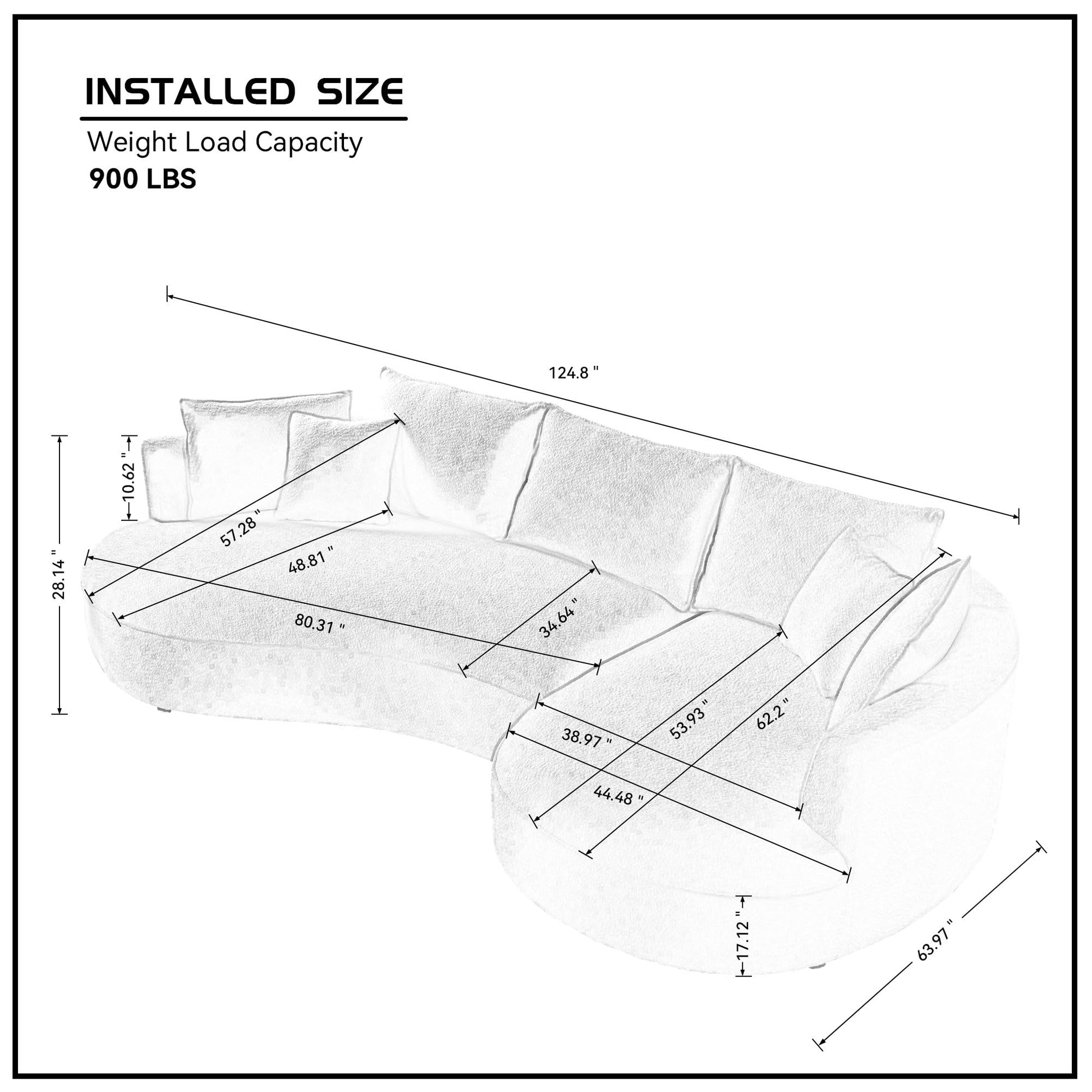 - [Spacious Layout with Right-Facing Chaise] With dimensions of 124.80"W x 63.97"D x 28.14"H, this right-facing chaise sectional sofa provides ample space for family, guests, or cozy lounging. Its cloud-like design creates a luxurious yet functional seating area.
