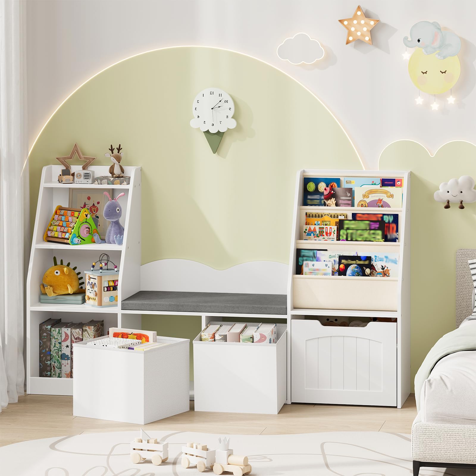 This all-in-one kids bookshelf combines a cozy reading nook with practical storage solutions. The 4-tier design features sling shelves for books, a padded bench seat, fabric storage bins, and a mobile drawer with smooth-gliding wheels. The charming cloud-shaped backrest and rounded corners create a safe, inviting space for reading and play.