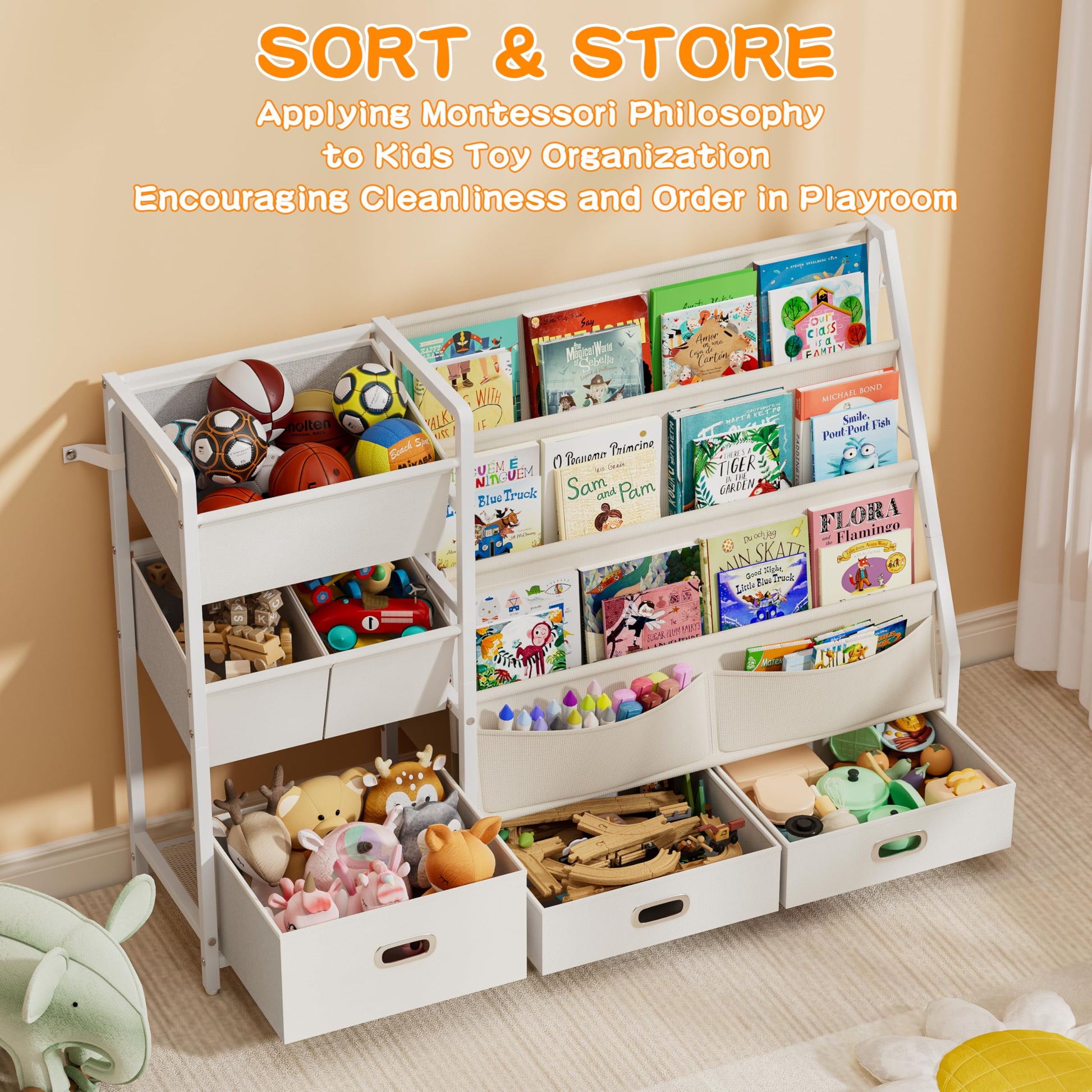 Transform your child's room with this versatile bookshelf and toy storage organizer. Designed with Montessori principles in mind, this multi-functional unit combines forward-facing book display with six removable storage bins, making it easy for children to independently organize and access their belongings.
