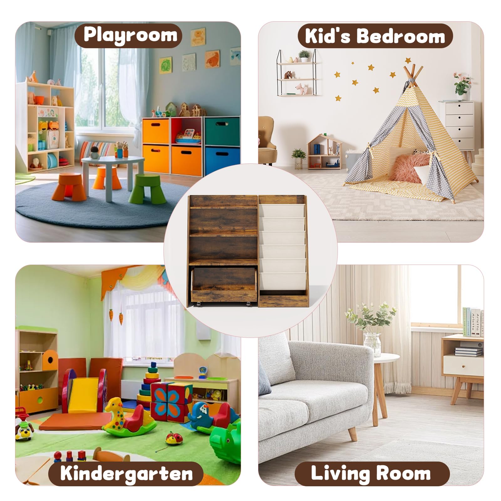 - Practical Storage Solution: Features 3-tier display shelves for books, toys, and ornaments, plus five sling pockets for easy storage of children's books, keeping them visible and accessible. Includes one drawer with rolling wheels that can be easily moved to different areas.