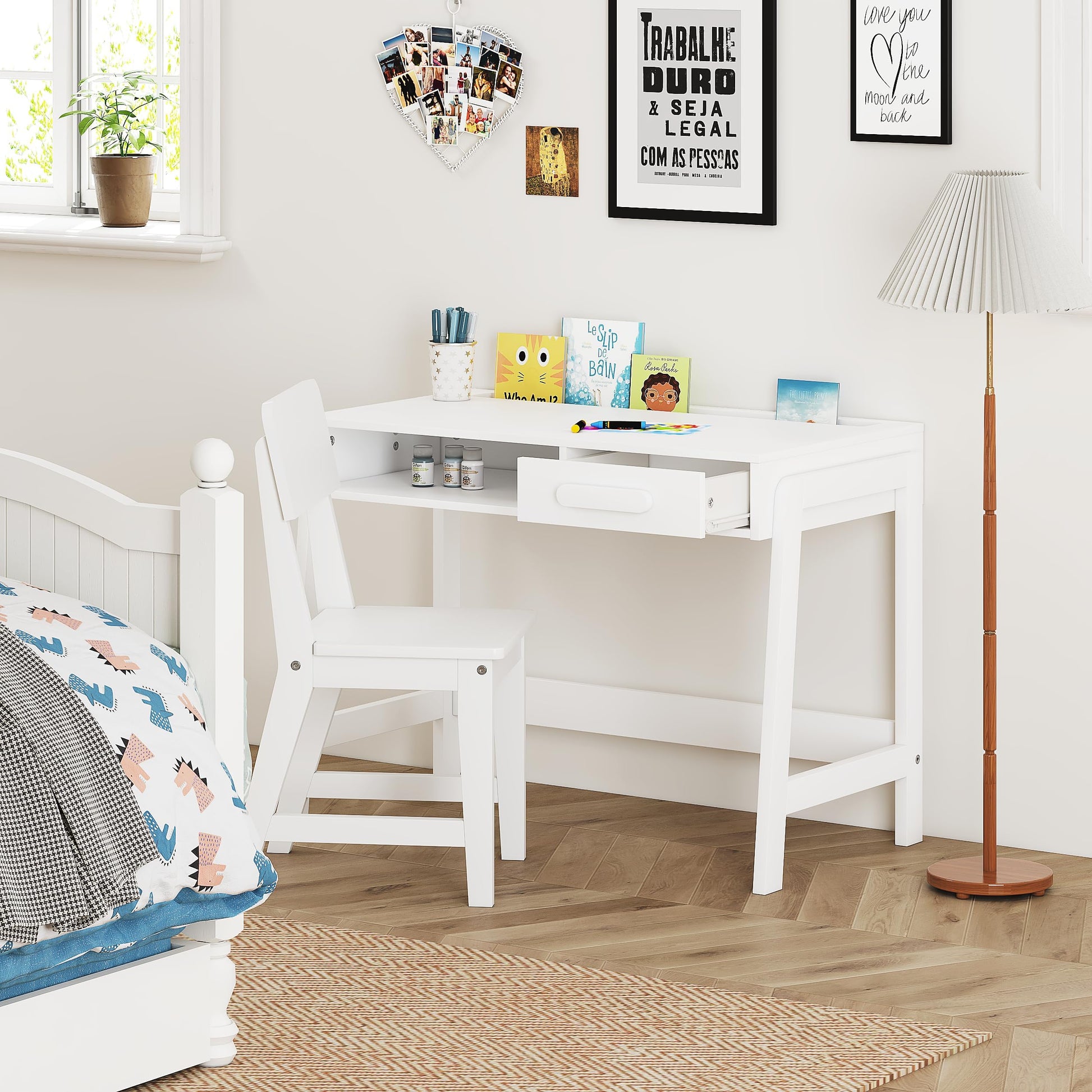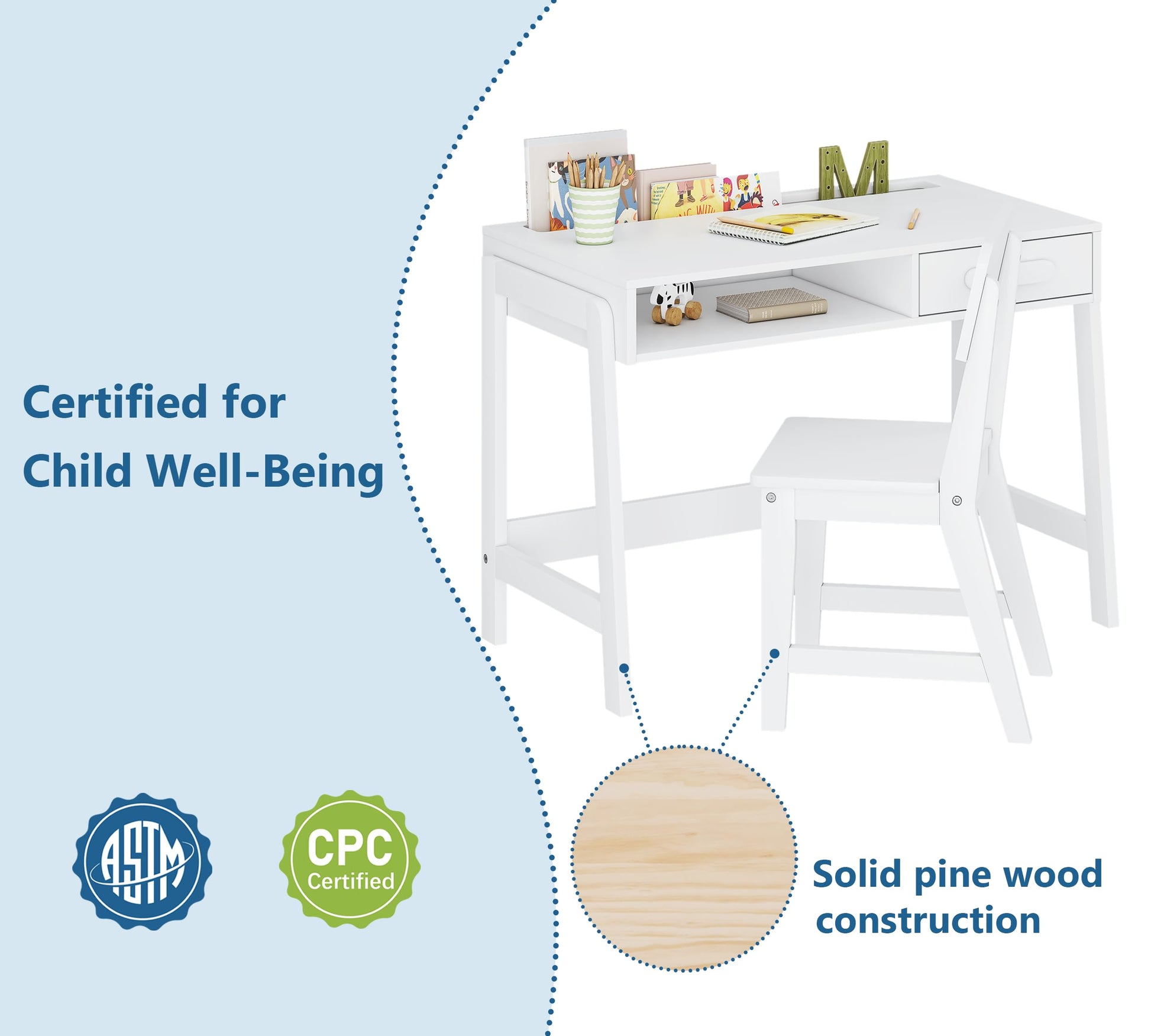 This ergonomic study desk and chair set is designed specifically for children aged 3-8 years, featuring solid wood construction, multiple storage solutions, and FSC-certified materials that meet ASTM, CPSIA, and CPC safety standards.