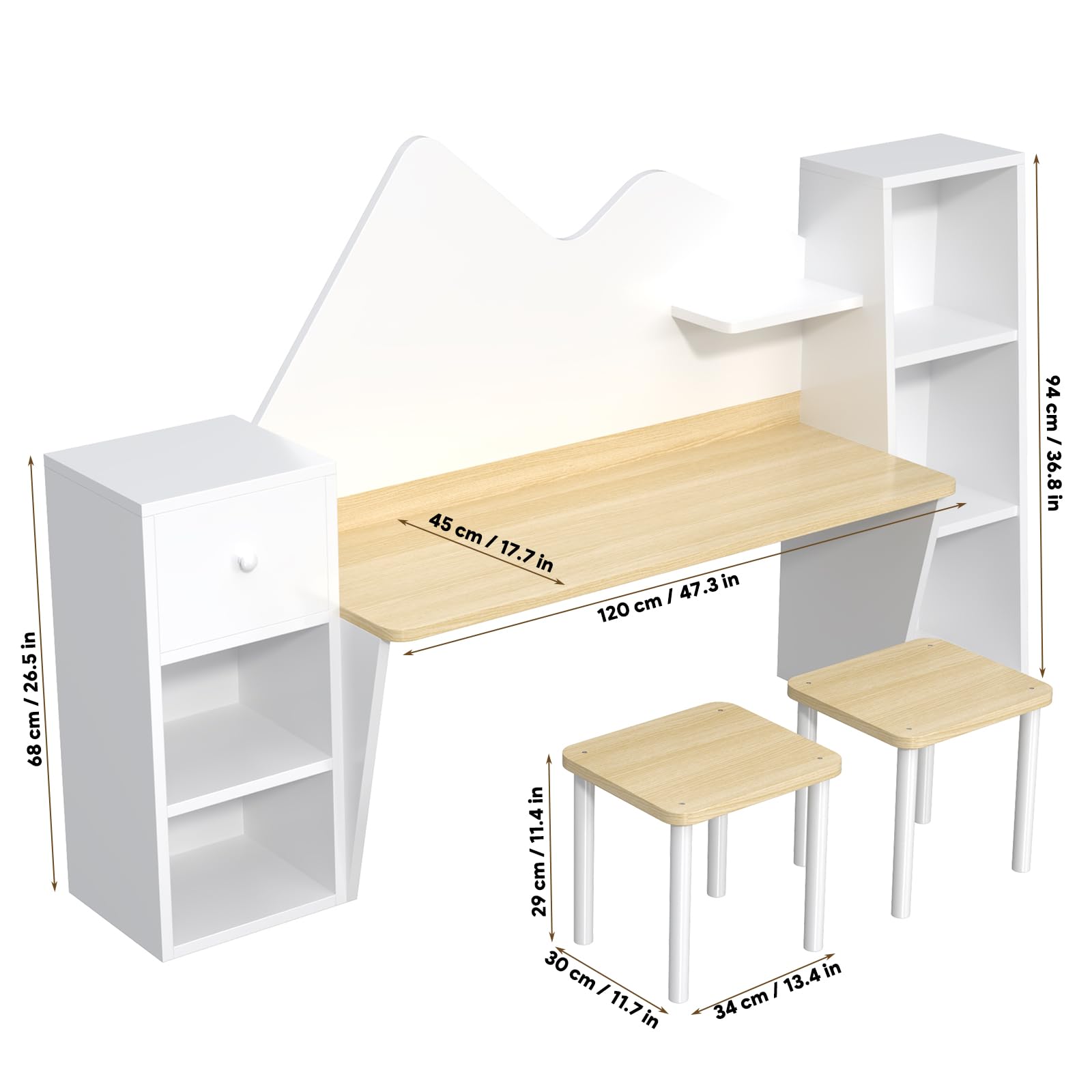 With a spacious desktop measuring 47.3" x 17.7", it provides ample room for two kids to study, draw, or complete homework side by side. Two included stools (13.4"L x 11.7"W x 11.4"H) help children sit comfortably, encouraging focus and a productive learning environment.