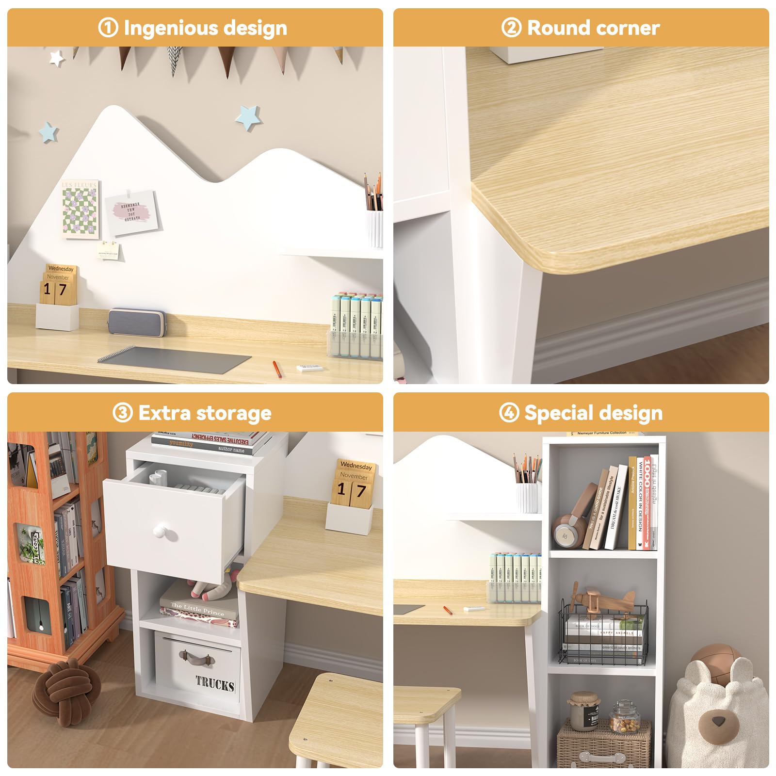 This kids' study desk is crafted from high-quality engineered wood, ensuring durability and safety. The smooth round edges and soft door closures minimize the risk of injury, making it a perfect choice for children's spaces.