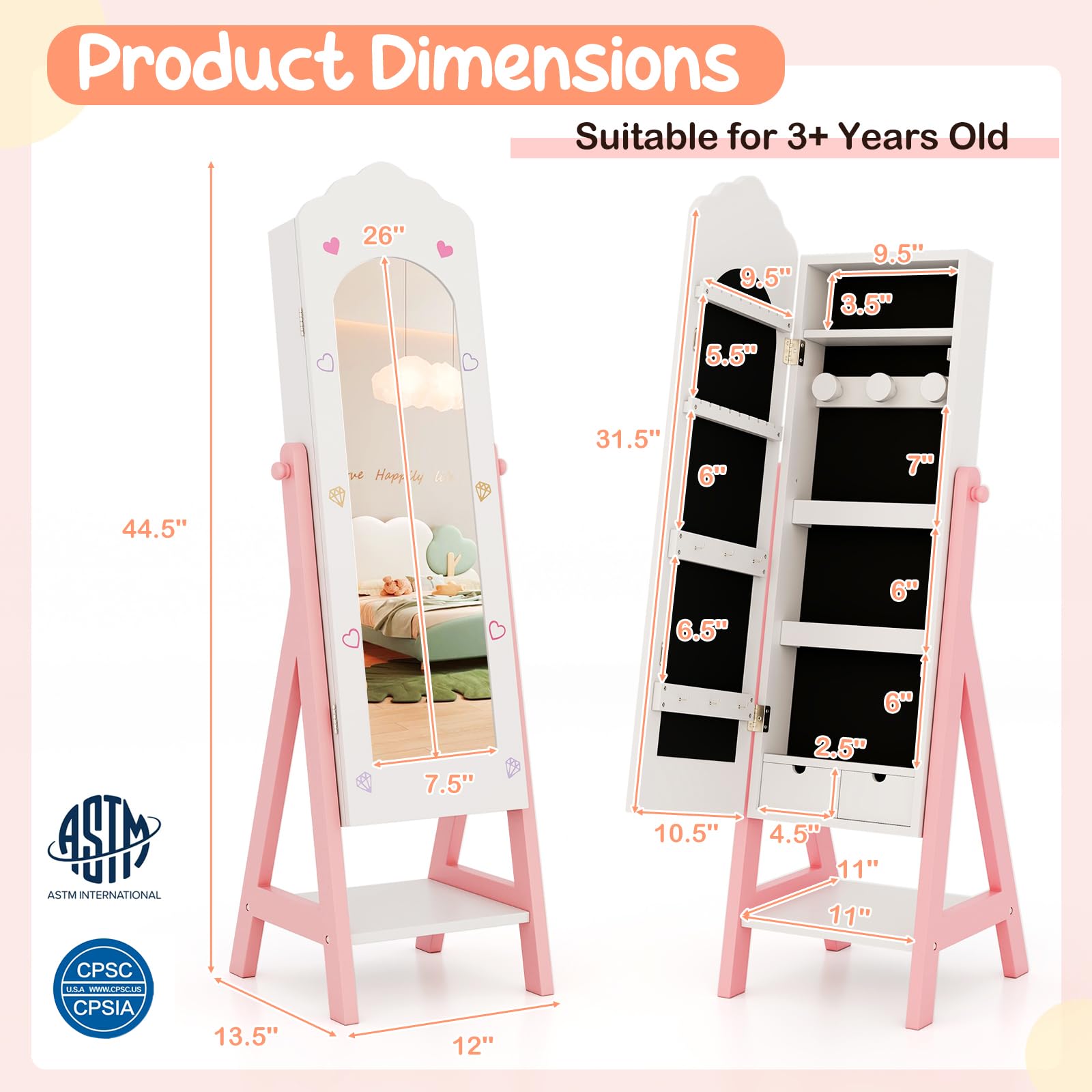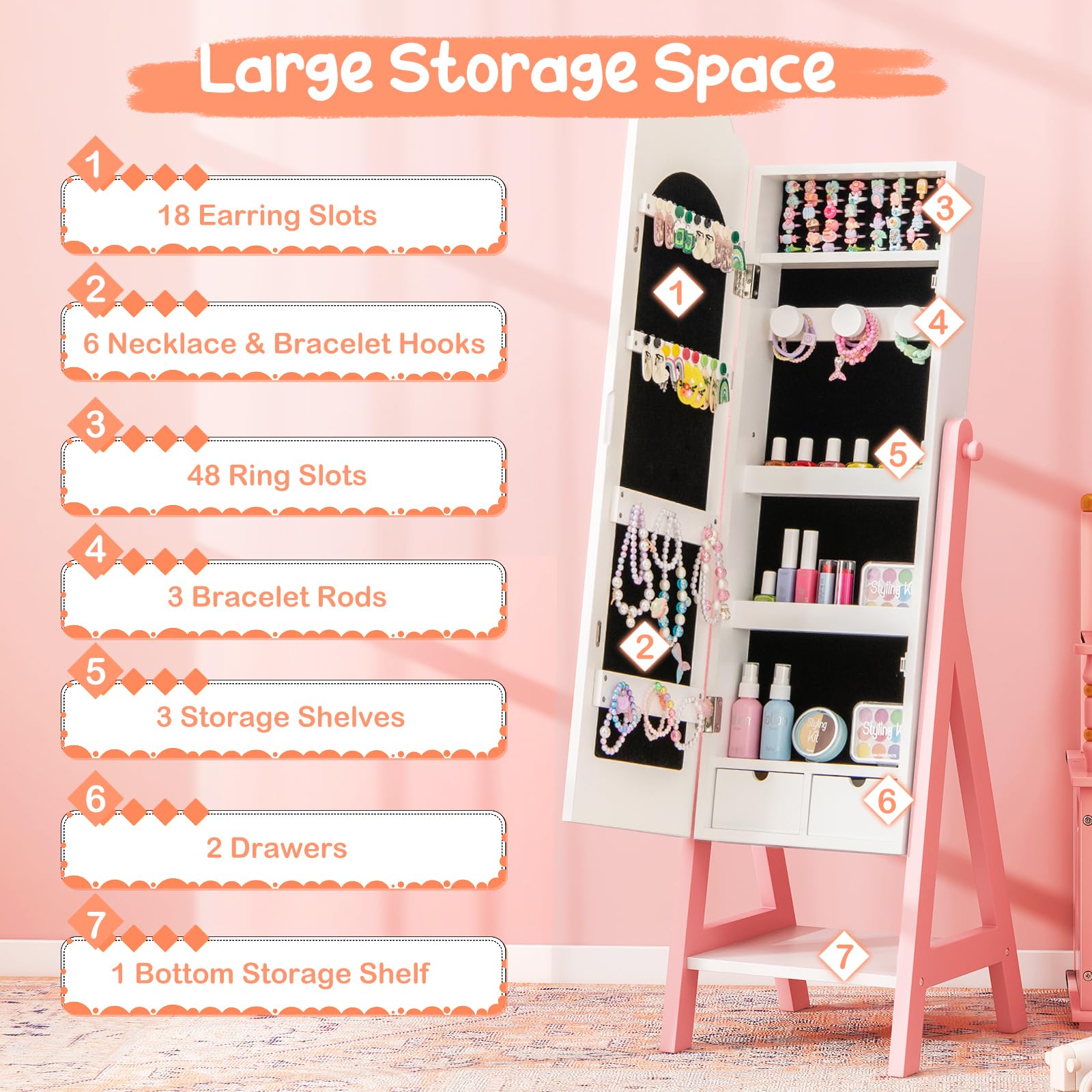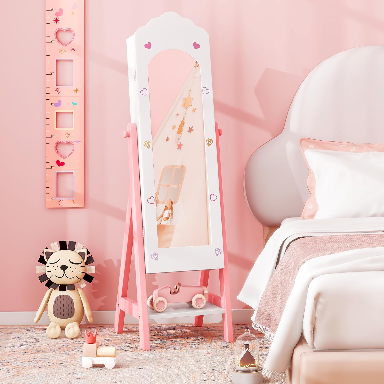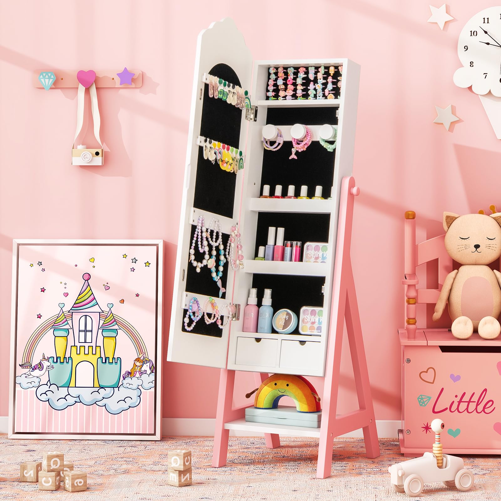 Transform your child's room with this elegant standing jewelry armoire cabinet featuring a full-length mirror. Designed specifically for young girls, this versatile piece combines functionality with style, offering ample storage for jewelry, accessories, and treasured keepsakes.