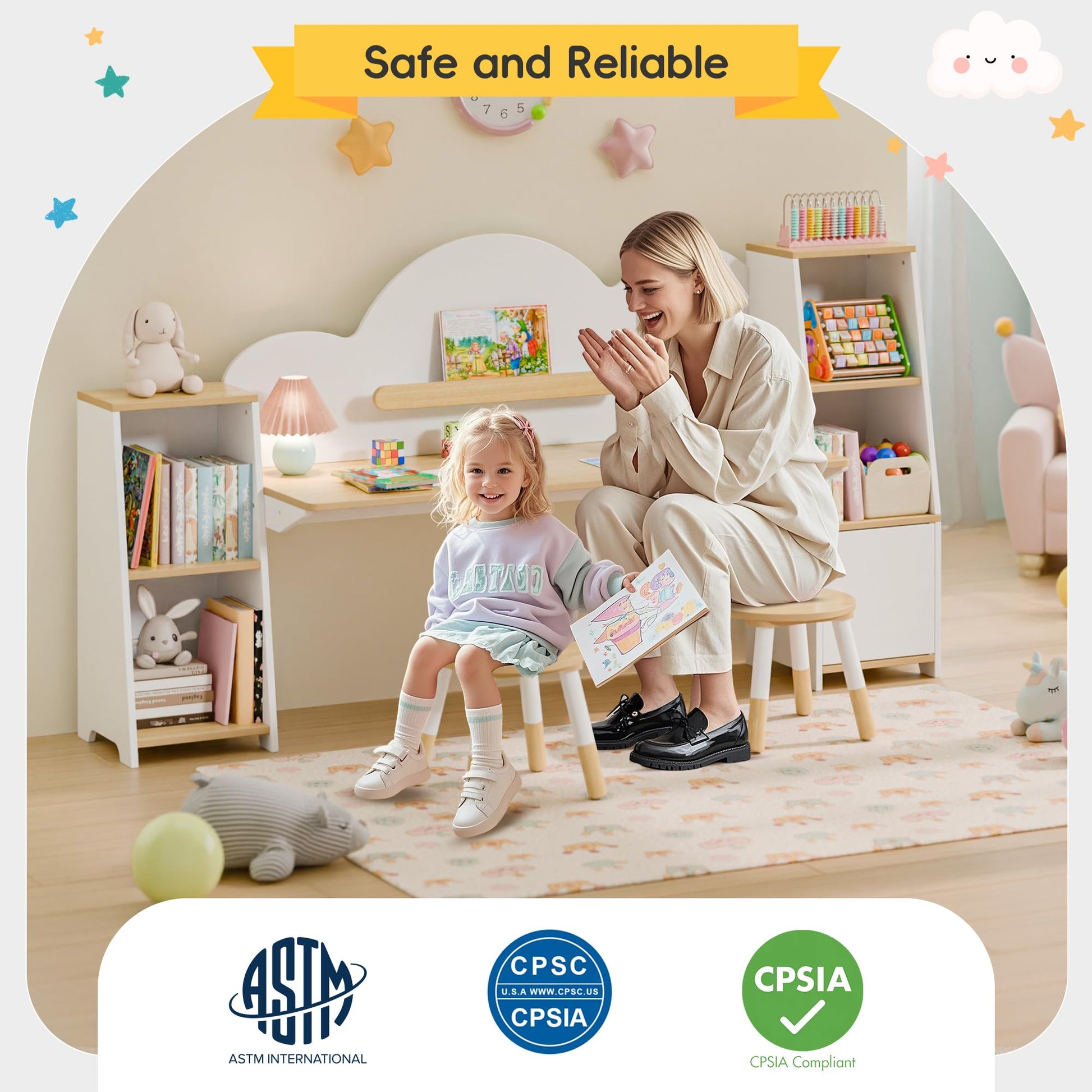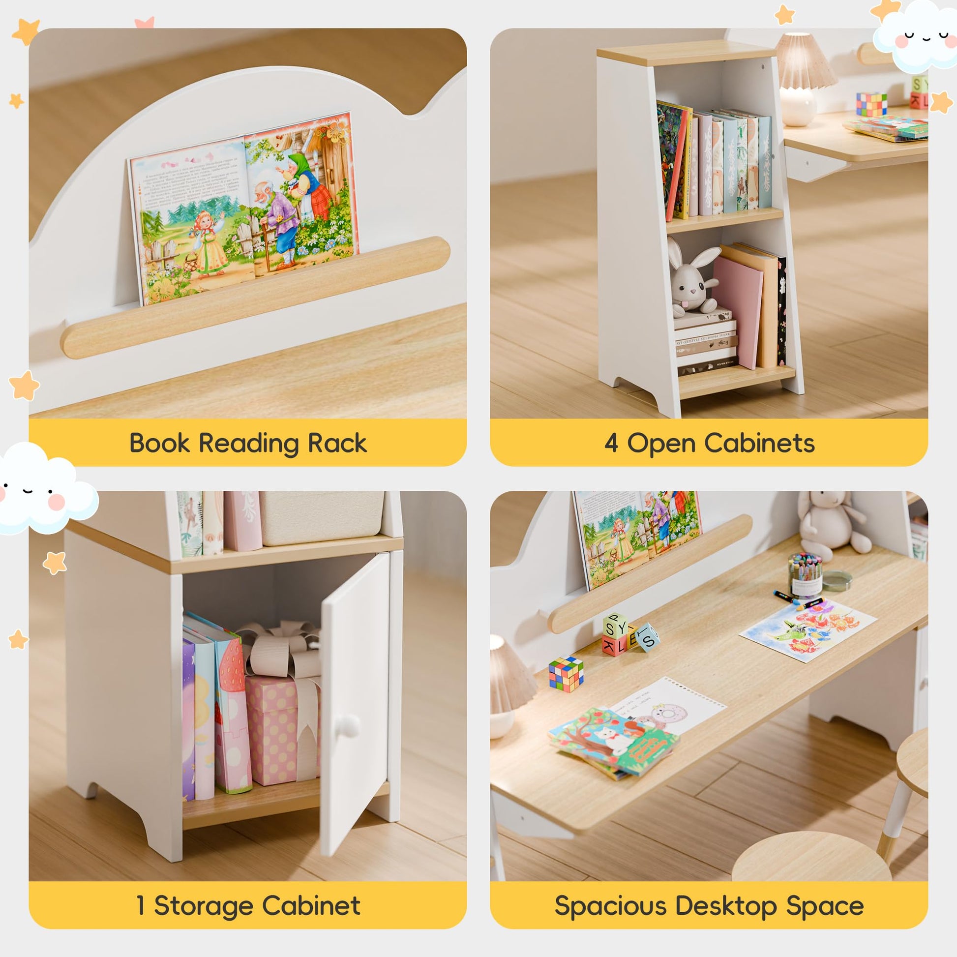 This versatile desk set includes two comfortable stools and five integrated storage cabinets, providing ample space for books, supplies, and learning materials. The built-in bookshelves keep favorite books within easy reach, encouraging reading habits and independent study.