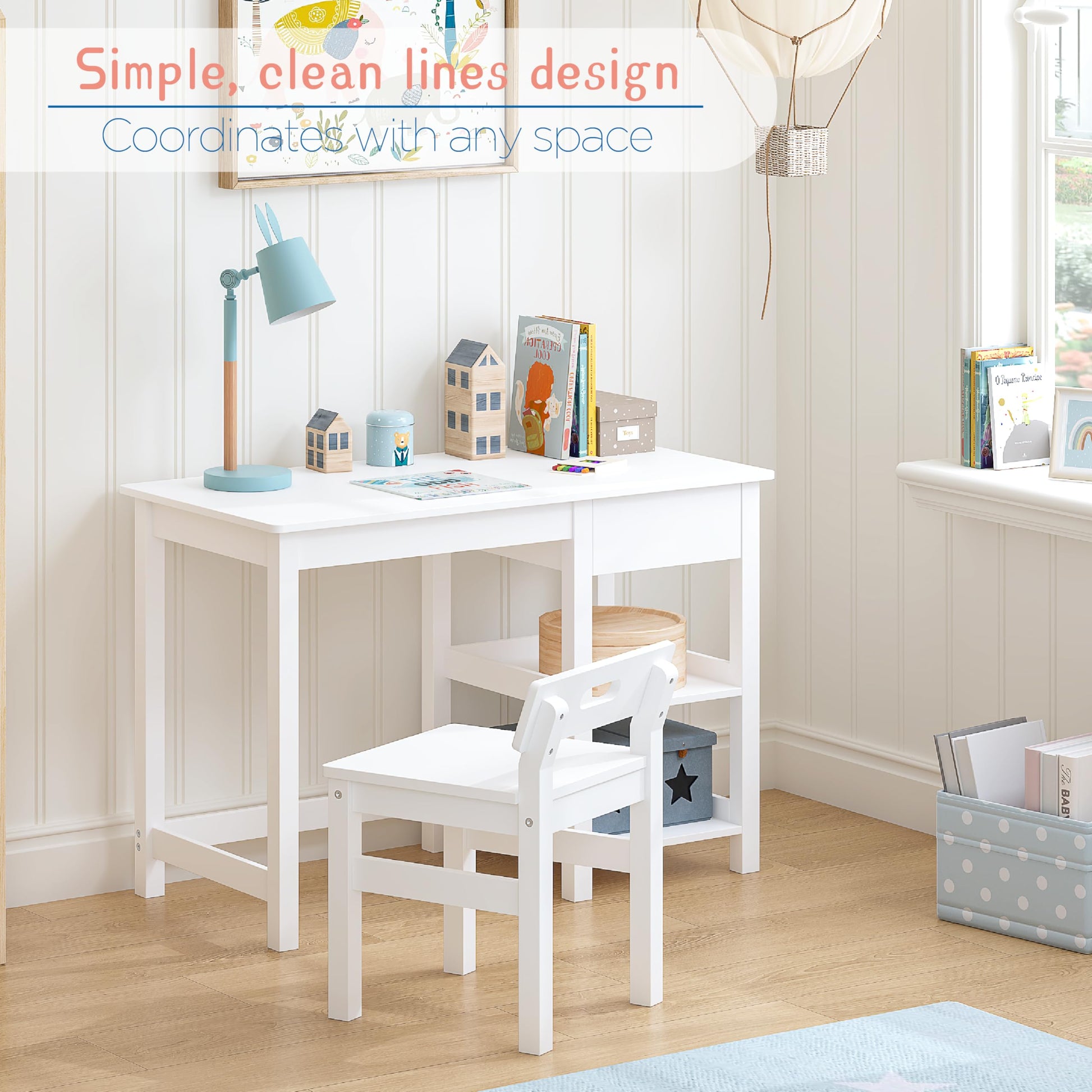 This study set features integrated storage solutions including a convenient drawer and multiple shelves to keep books, supplies, and materials organized. The ergonomic design promotes proper posture during homework, reading, and creative activities.
