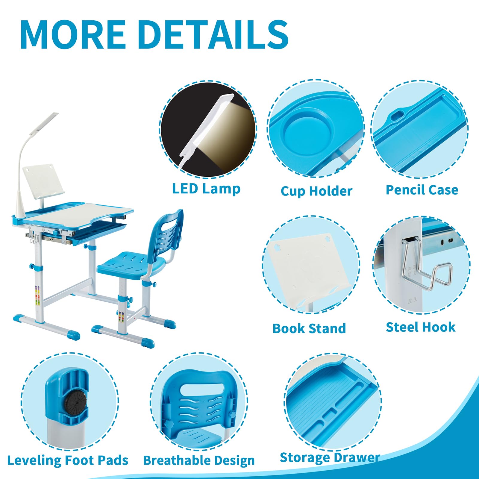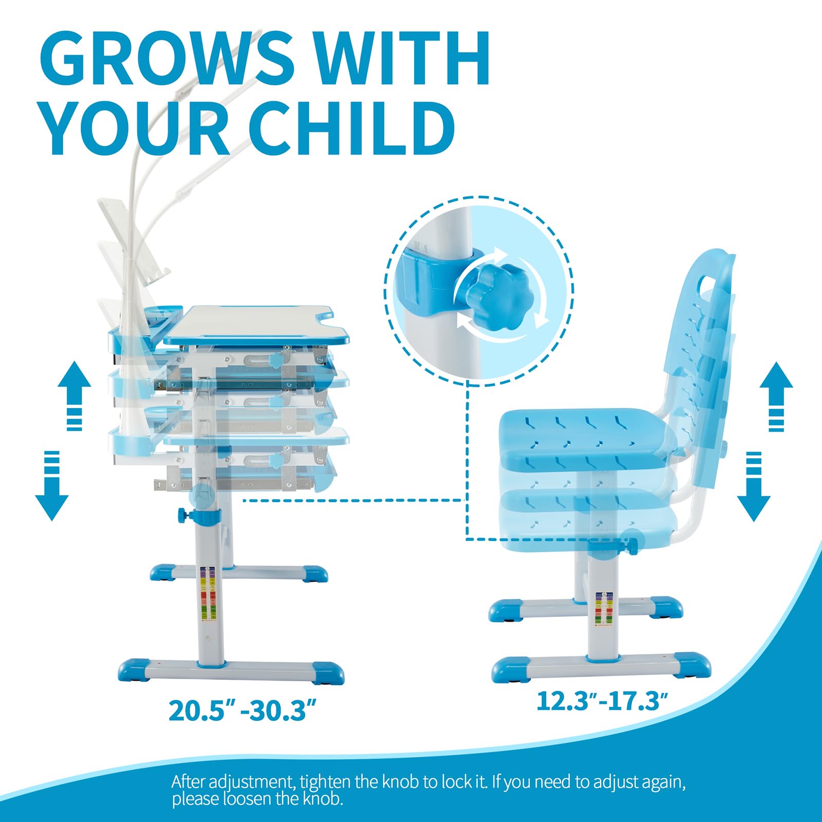- Adjustable Height System: Both desk and chair heights can be easily adjusted to accommodate children ages 7-12 years, growing with your child over time