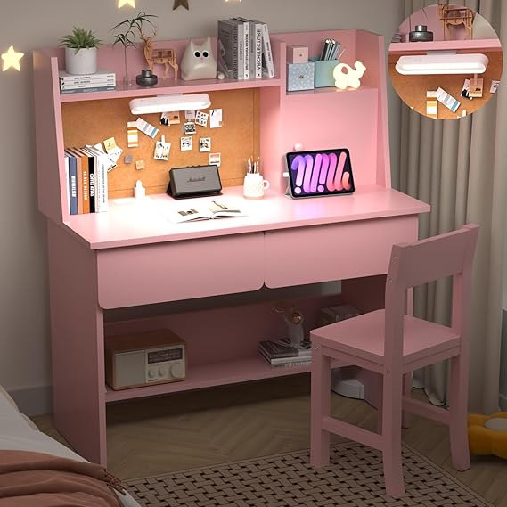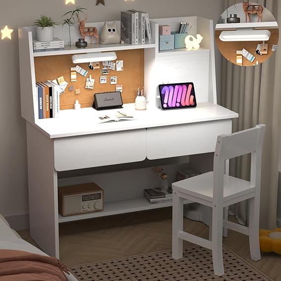 Constructed from safe, environmentally-friendly engineered wood and solid pine, this desk and chair combination delivers exceptional durability and stability. The desk supports up to 176 pounds while the chair holds up to 230 pounds, ensuring long-lasting performance. Multiple storage options including drawers, hutch shelving, and a corkboard clipboard help keep supplies organized and within reach.