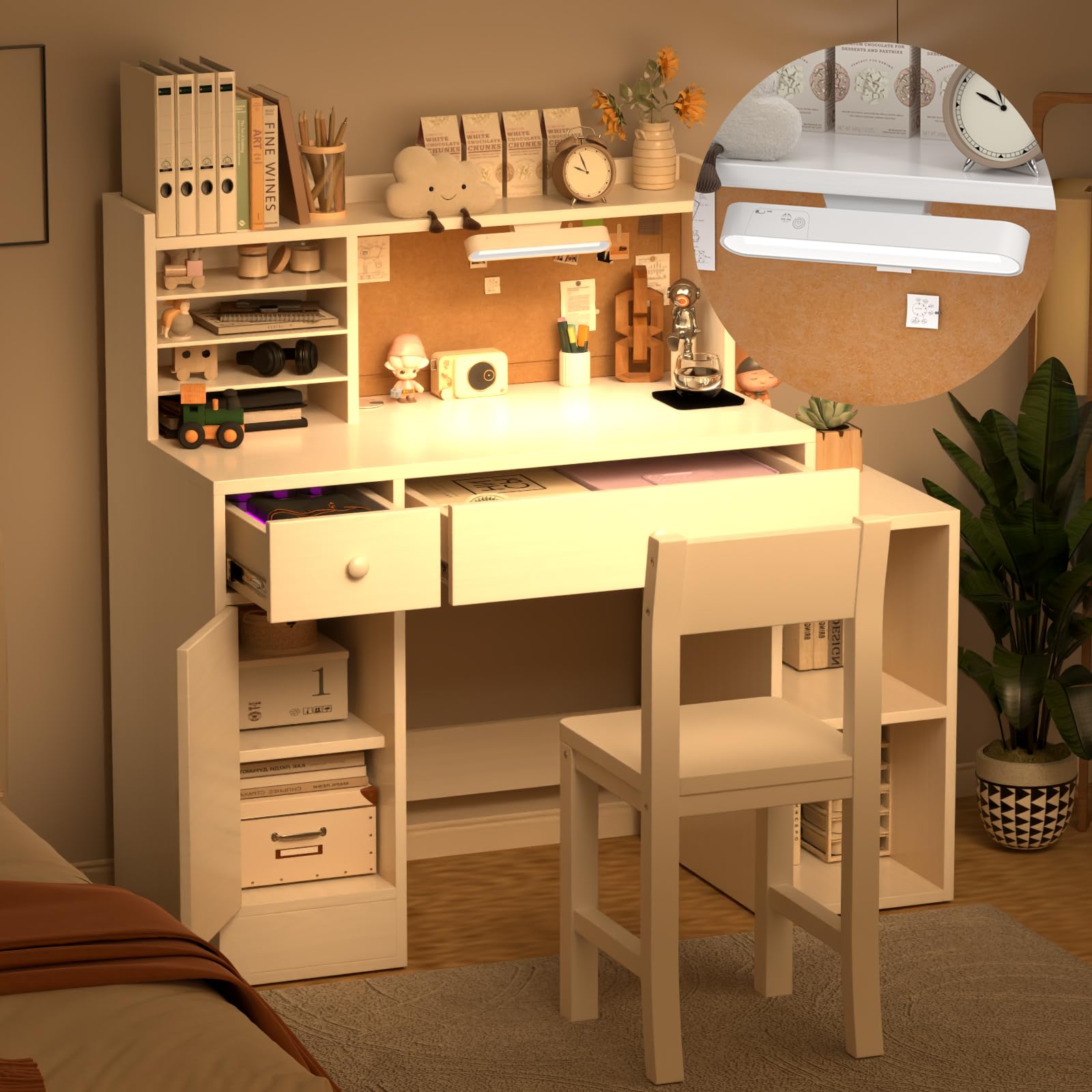 Transform your child's bedroom into an organized study space with this comprehensive desk and chair set. Designed for comfort and functionality, this modern writing desk features integrated lighting, ample storage, and a clean white finish that complements any room decor.