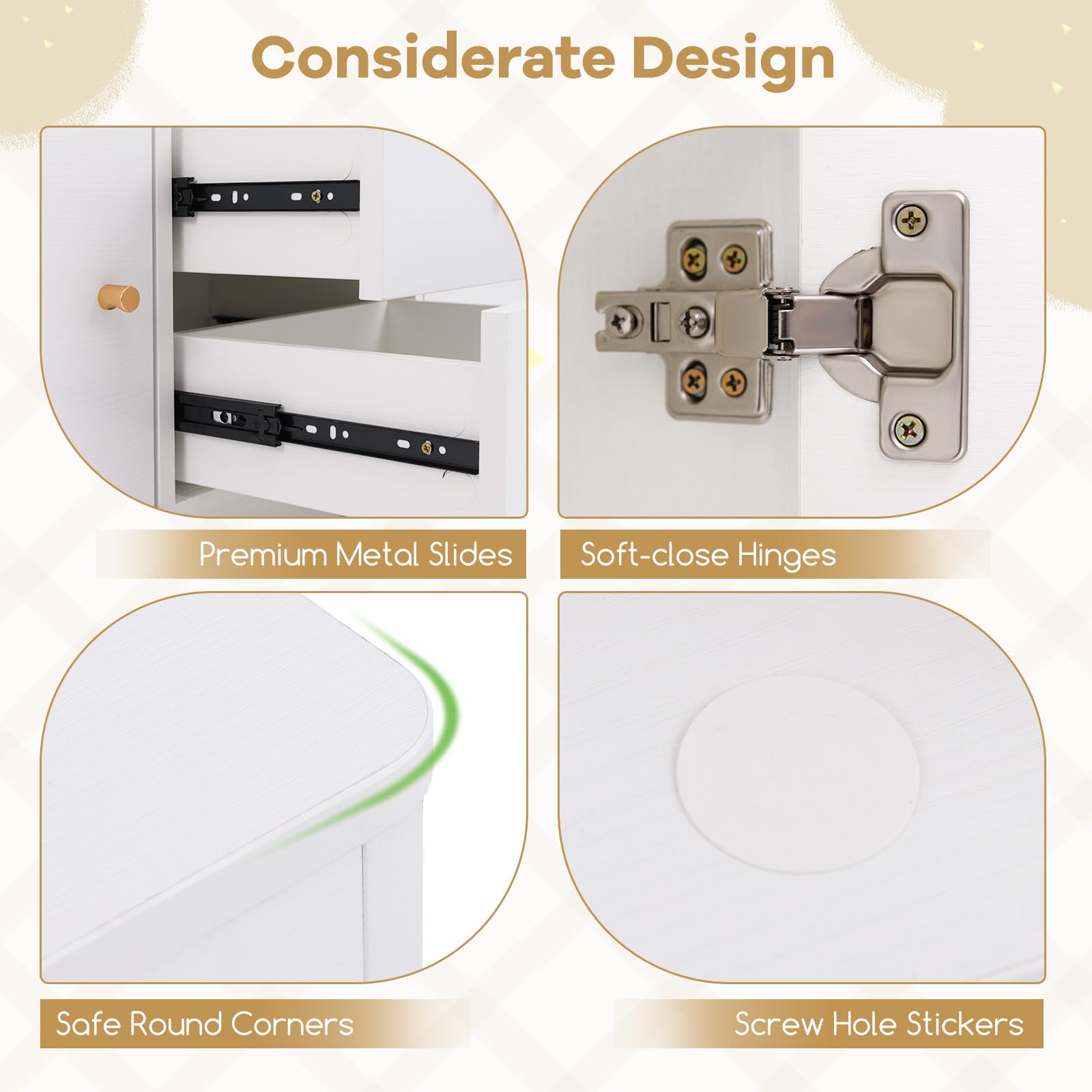 - Soft-Close Hinges: Quiet door closure prevents pinched fingers and reduces noise