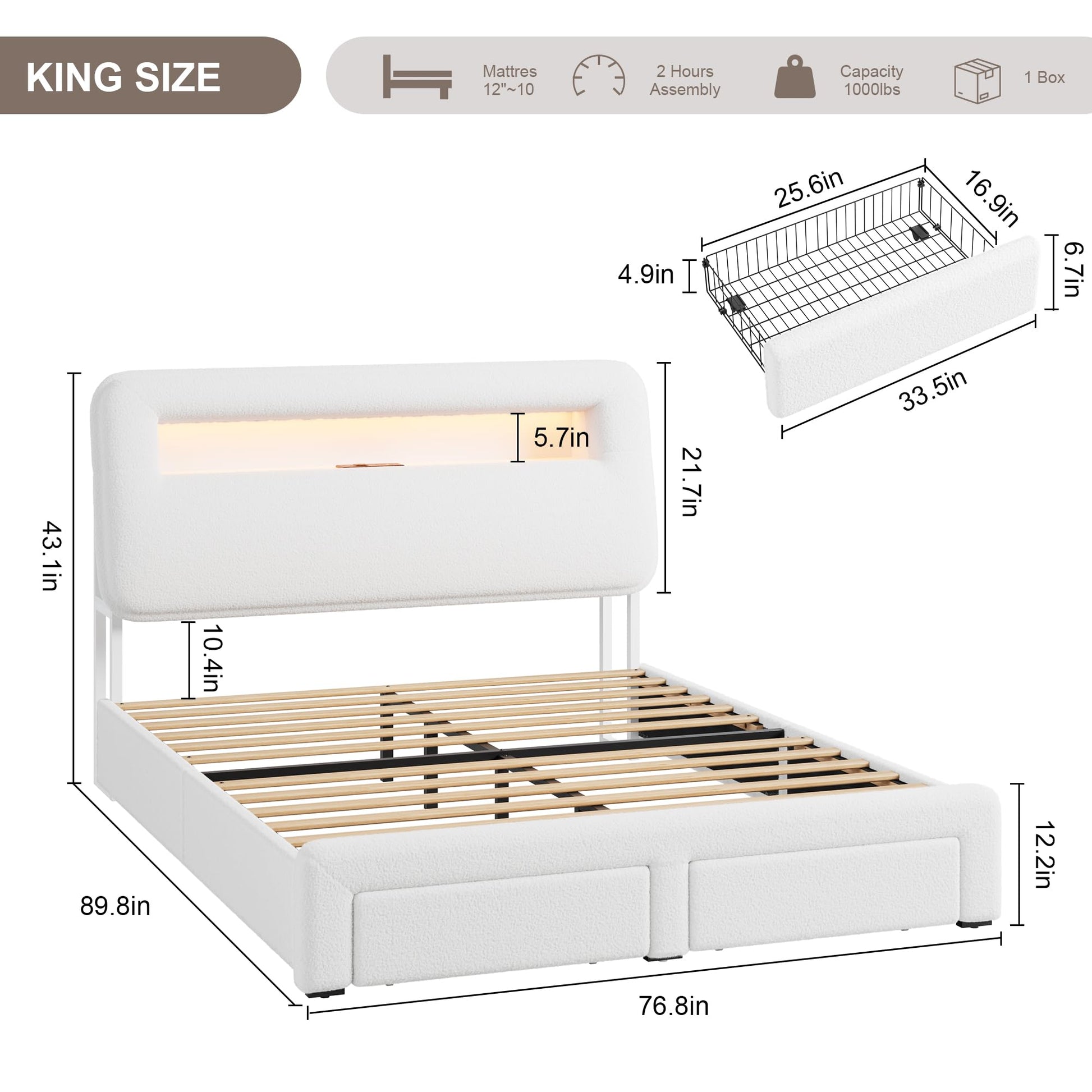 Upgrade your bedroom with this modern king size platform bed frame featuring a built-in charging station, ambient LED lighting, and smart storage solutions. The teddy fleece upholstered headboard provides both comfort and style, while two spacious underbed drawers keep your space organized.