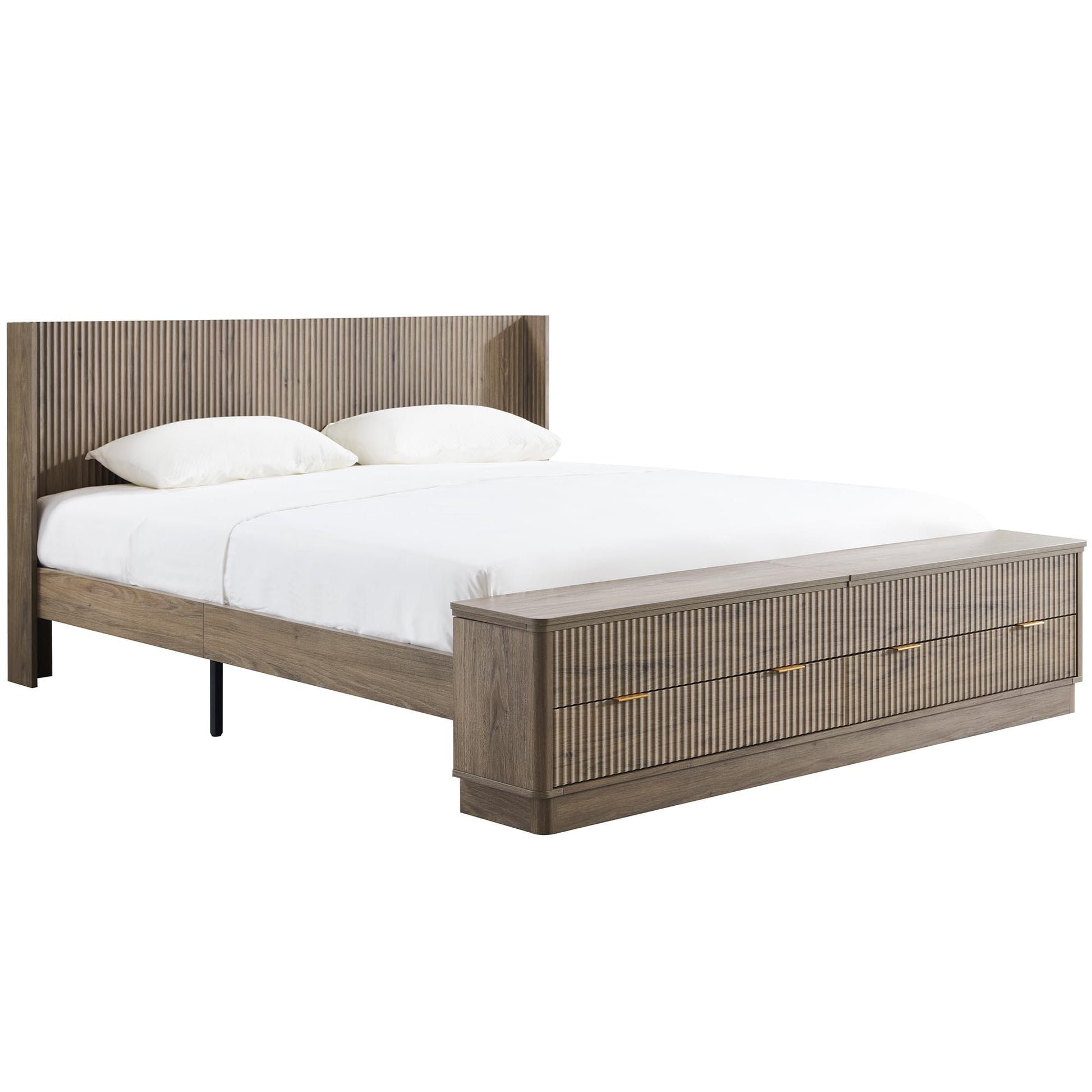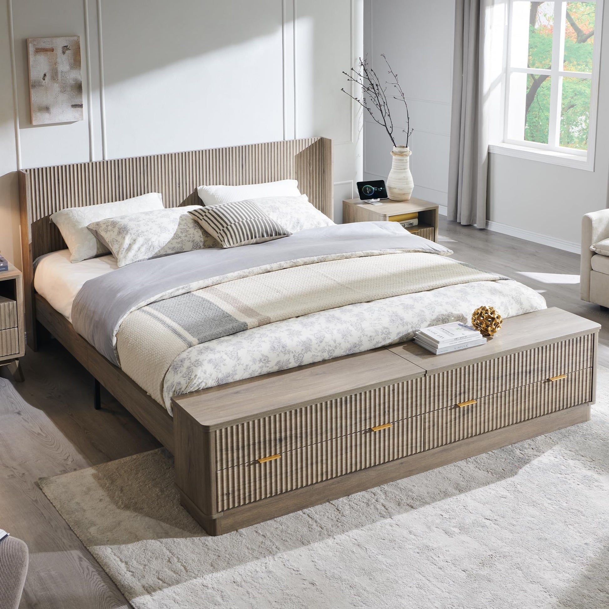 Elevate your bedroom with this architectural fluted platform bed featuring a wingback headboard and integrated storage bench. Designed for modern living, this king-size bed combines sophisticated style with practical functionality.