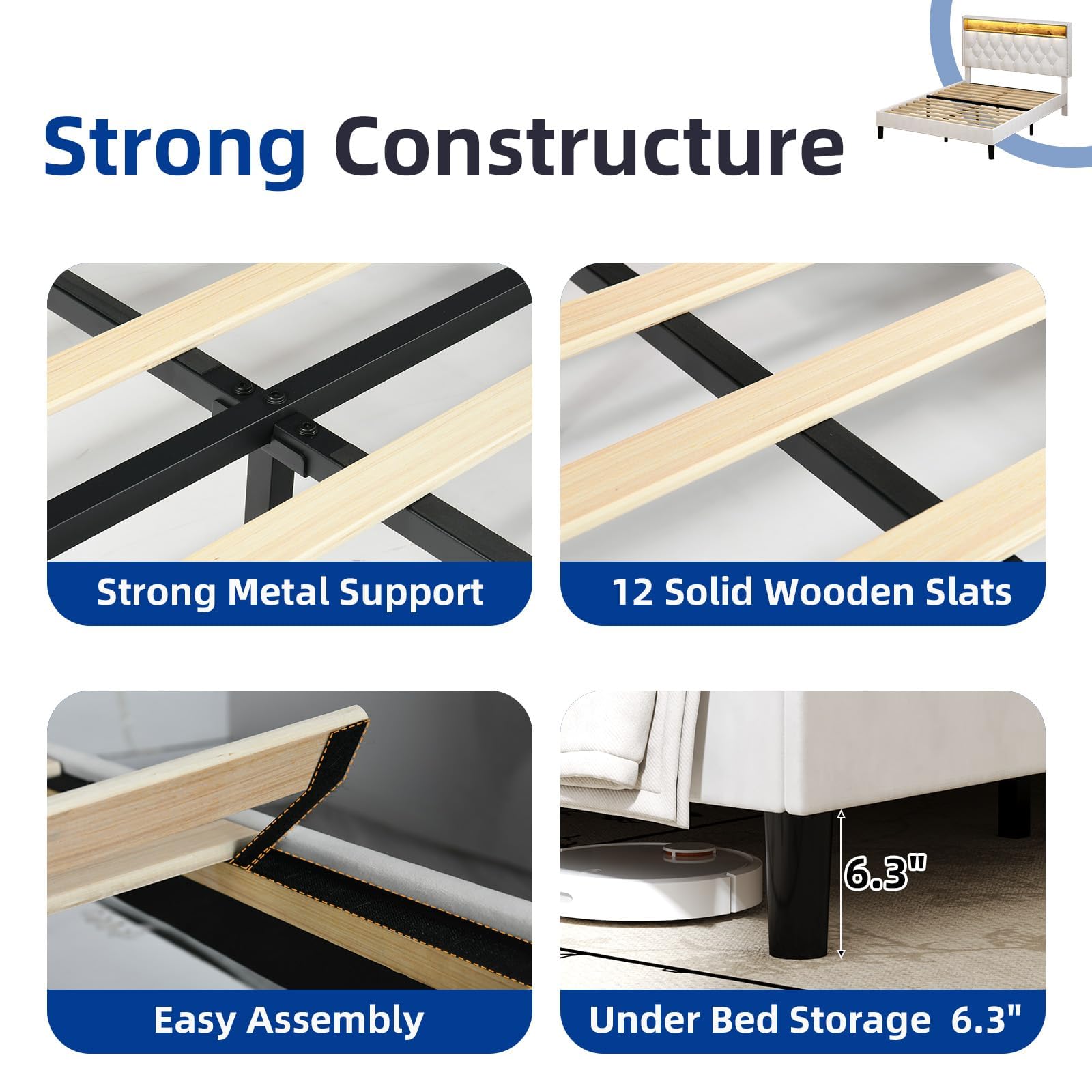 This modern king size bed frame combines luxury velvet upholstery with functional features including built-in LED lighting and a convenient charging station. The diamond-tufted headboard with rivet accents creates an elegant focal point for any bedroom.